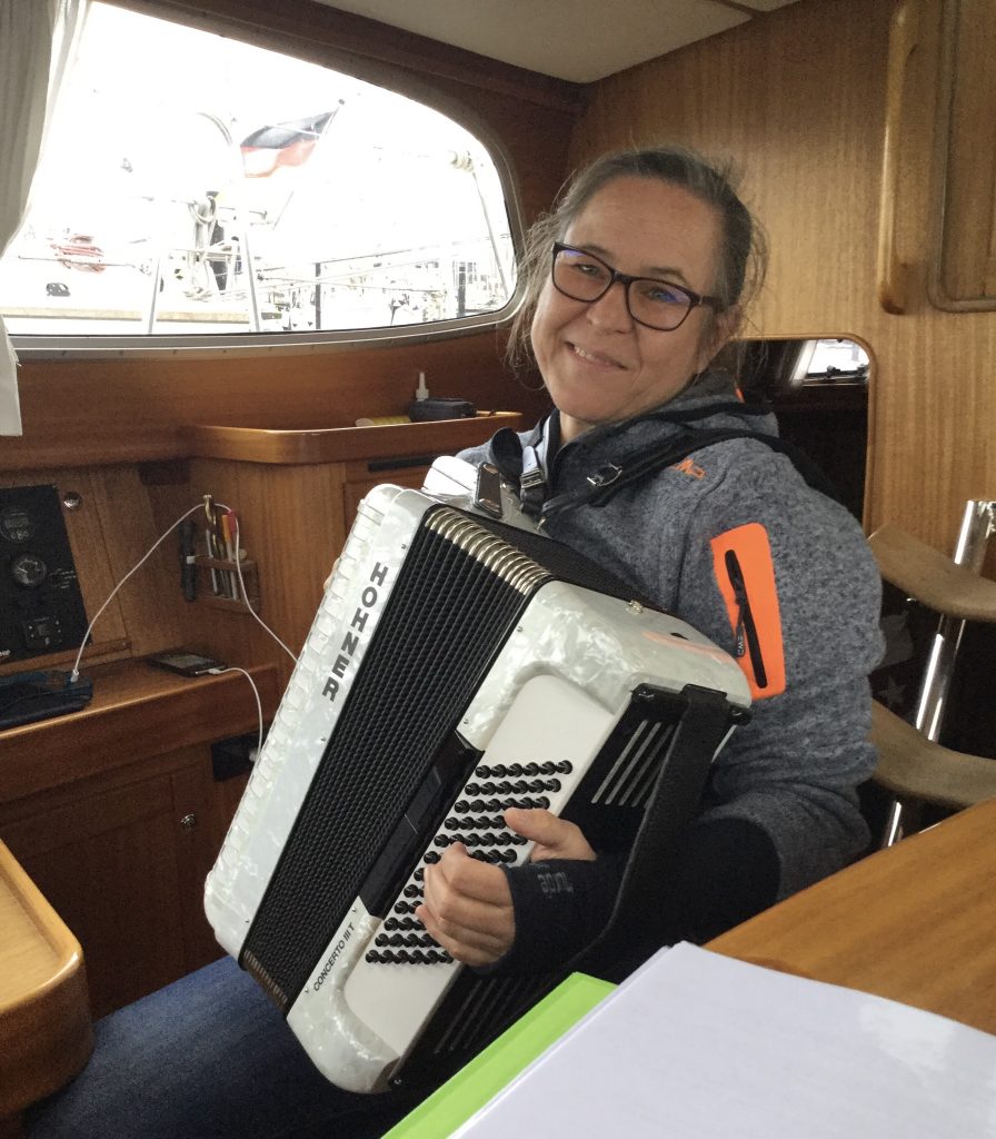 Übrigens ist das Akkordeon auch mit an Bord und wir haben Zeit für einige erste Lieder – wir müssen schließlich noch üben (Petra die Melodien und Kalli die Lied-Texte)… aber langsam wird‘s