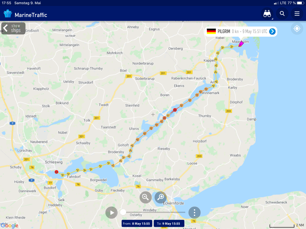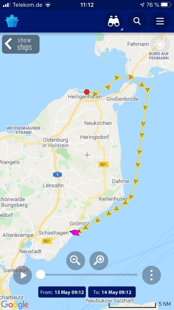 Aber da wir bei der Strecke von Schleswig (Winterlager) bis Grömitz (Heimathafen) idealerweise zwei Übernachtungsstopps einlegen wollten, wäre Heiligenhafen einer davon. Dass wir in Maasholm übernachten dürfen, wurde uns durch die Werft in Schleswig zugesichert. Und das haben wir dann einfach mal geglaubt.