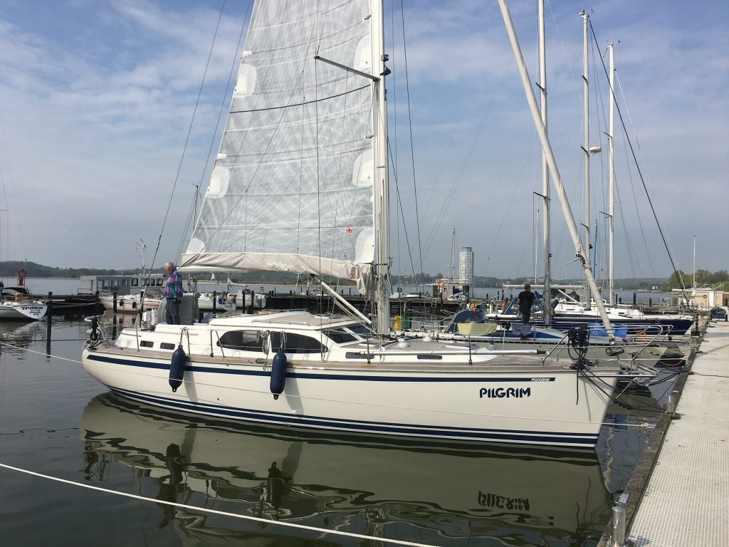 Wir machen uns auf den Weg nach Grömitz. Wieder wenig Wind – die Unterwasser-Genua muß ran – und leider treffen uns auch immer mal wieder Regenschauer. Doch was soll’s – dazu hat man ja eine Decksalon-Yacht: man kann bei regnerischem Wetter unter Deck gehen und trotz allem gut rundum Ausschau halten.