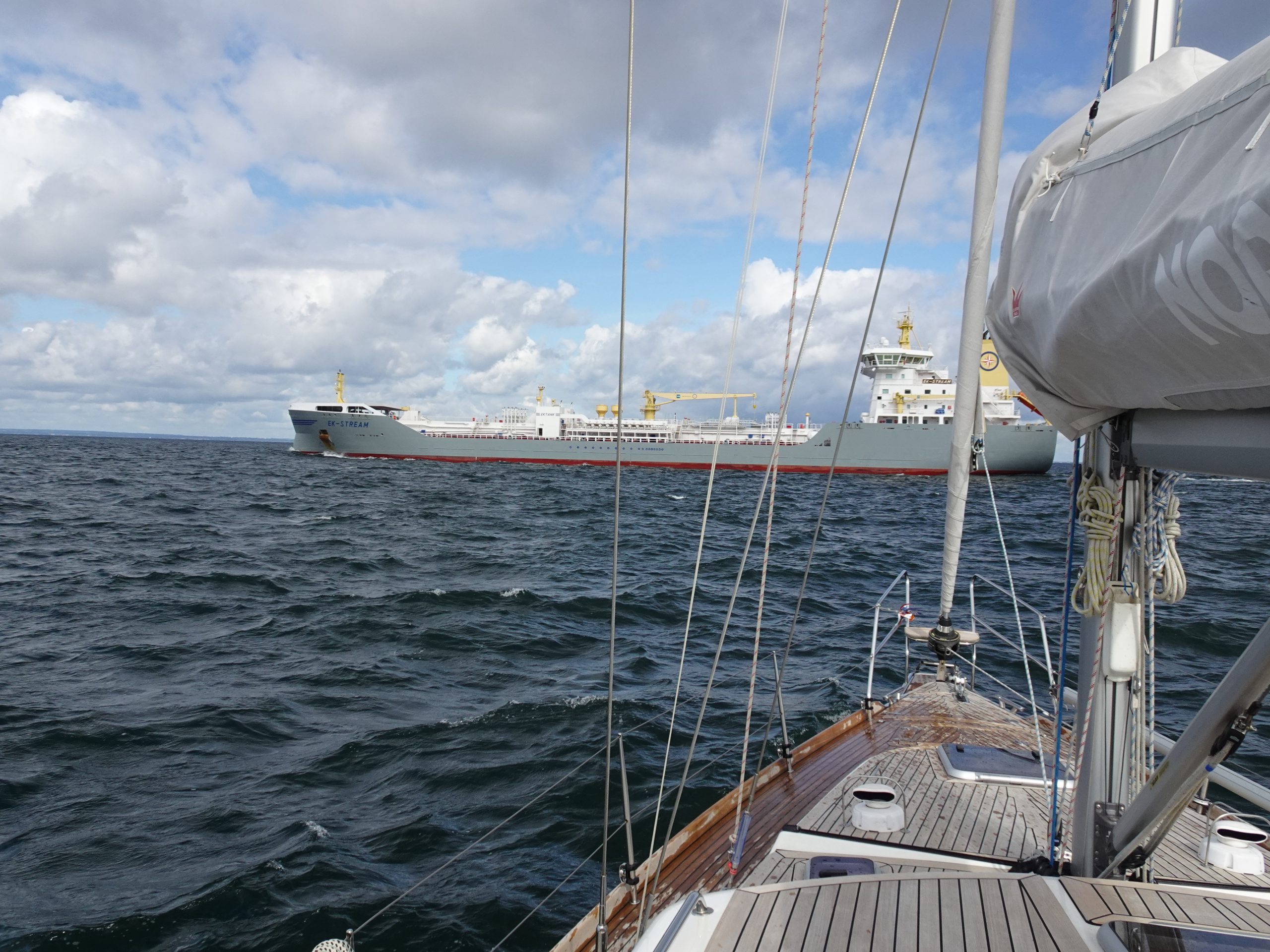 Unterwegs ist erhöhte Aufmerksamkeit gefragt, denn wir kreuzen einen viel befahrenen Schifffahrtsweg durch den Langelandsbelt – und prompt kommen zwei große und schnelle Pötte, denen wir lieber Platz machen.