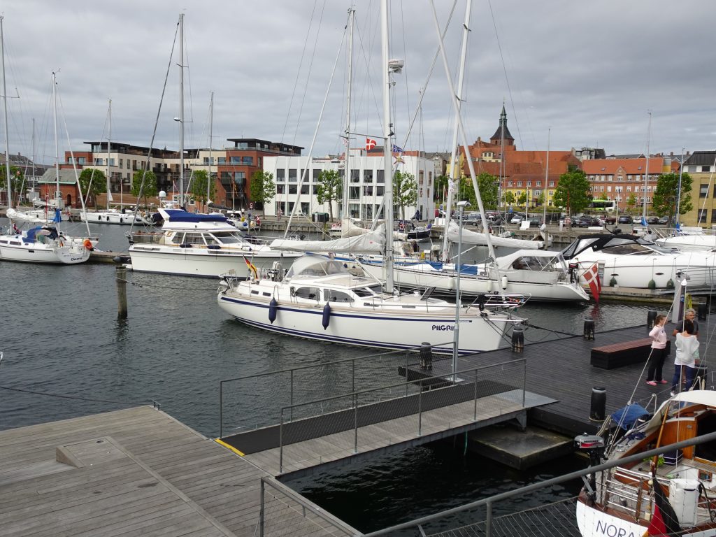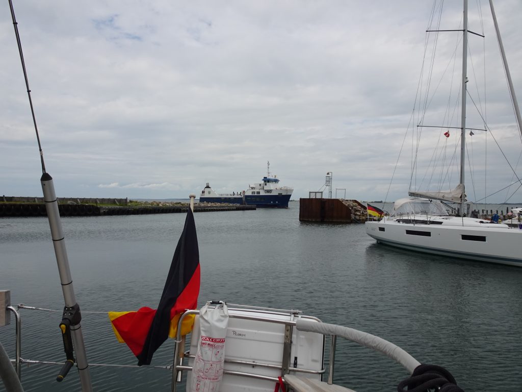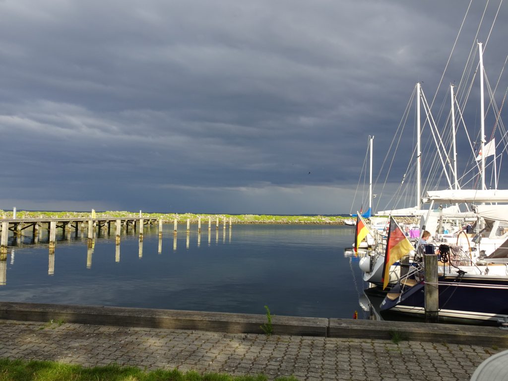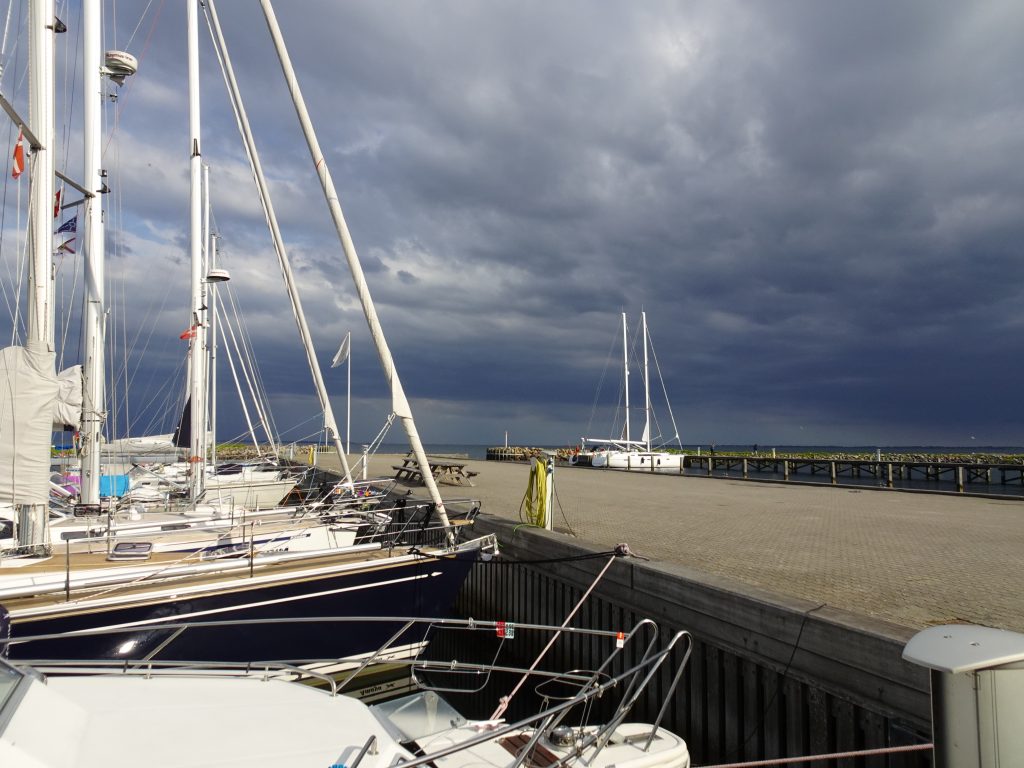 Wir genießen das Hafenkino der einlaufenden Schiffe, leckeren Fisch von „Jensen‘s Fisk&Vin“ und den friedlichen Sommerabend. Es ziehen zwar immer mal wieder arg dunkle Wolken auf, aber die Sonne setzt sich durch.