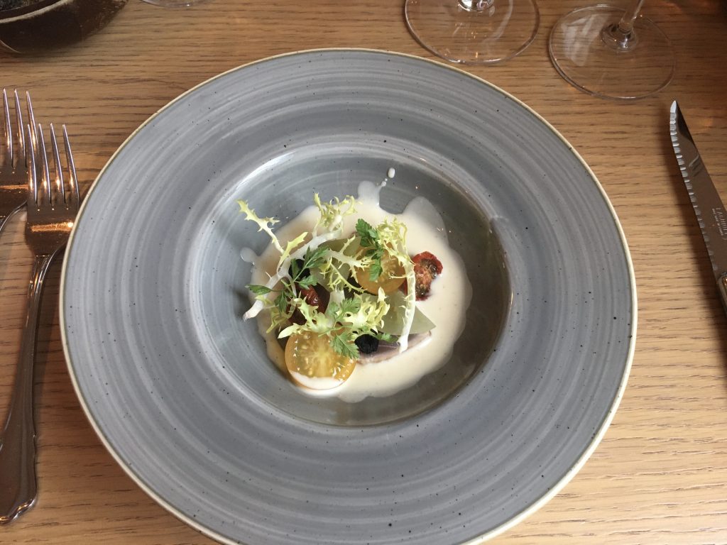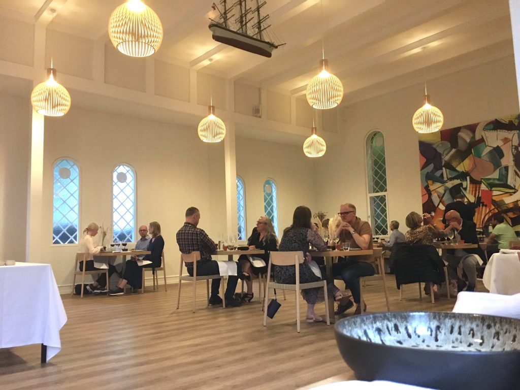 … und freuen uns heute Abend auf leckeres Essen im „Resumé“, unserem Lieblingsrestaurant in Svendborg. Hier wird immer ca. 3-4 Wochen nur ein Menue serviert, immer mit begleitenden Weinen, immer gleicher Preis. Wir haben es vor 3 Jahren kennengelernt – da hatten sie grad den 2.ten Tag eröffnet. Einfach klasse! Das Konzept hat sich offenbar bewährt – es gibt das Restaurant noch und sie sind jetzt in größere Räume umgezogen: es wurde eine ehem. Kirche (!) sehr edel renoviert und stilvoll und reduziert eingerichtet. Und das Essen war wieder sehr lecker. Und der Service ebenfalls ausgezeichnet.