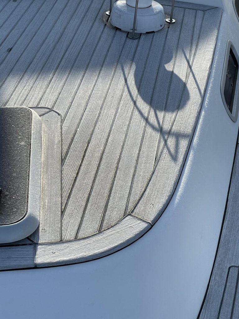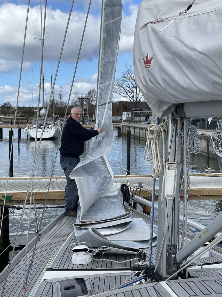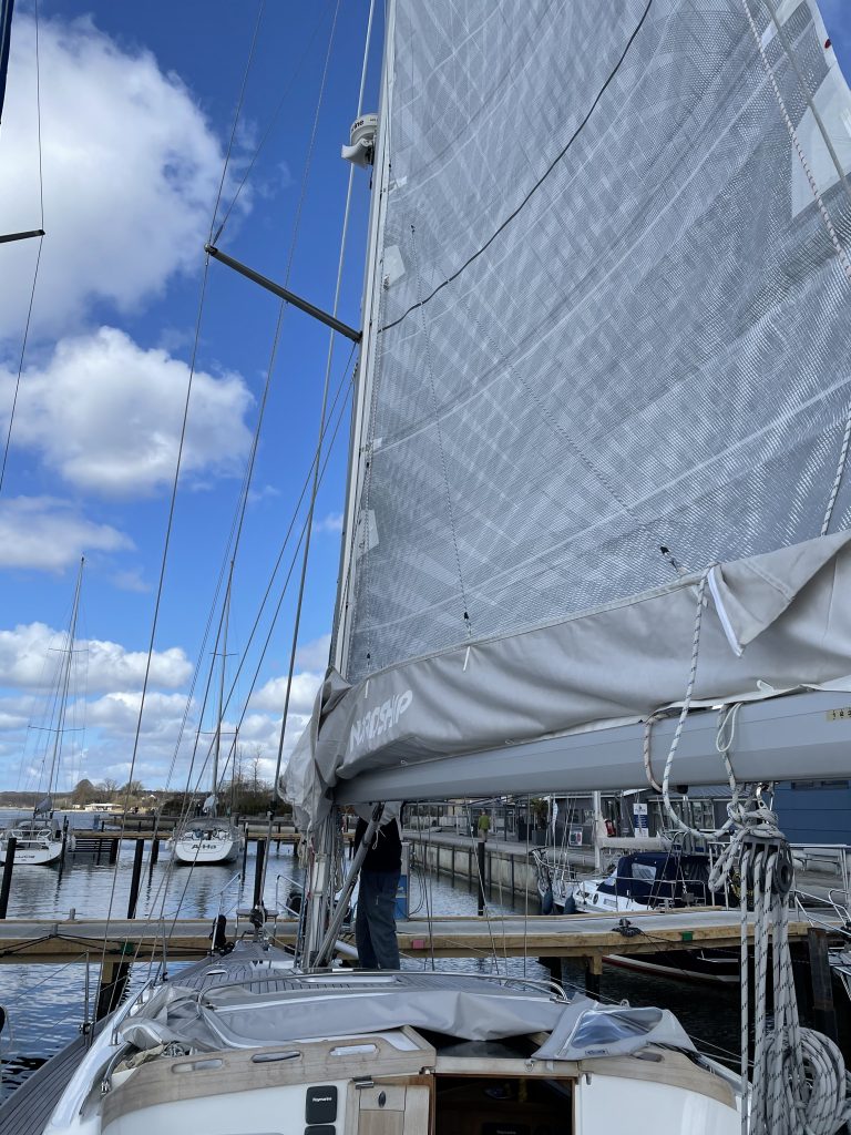 Wir lassen uns aber erstmal nicht unterkriegen und nutzen das schöne Wetter – Sonne, wenig Wind direkt von vorne – um unsere Segel anzuschlagen. Klappt alles prima.