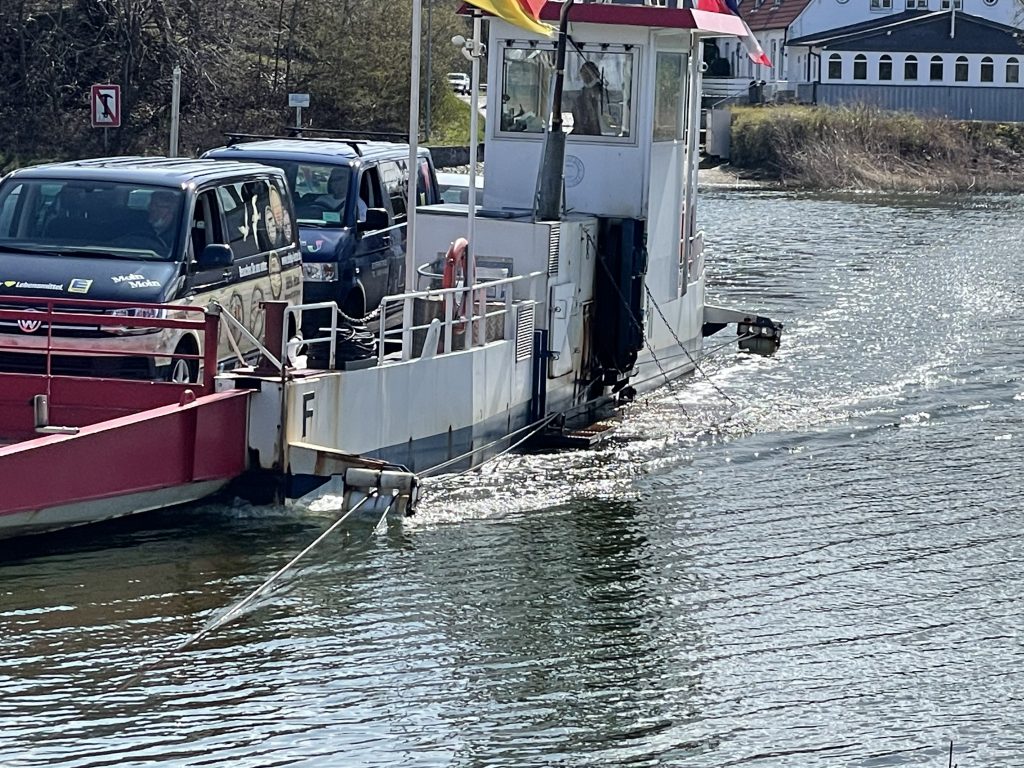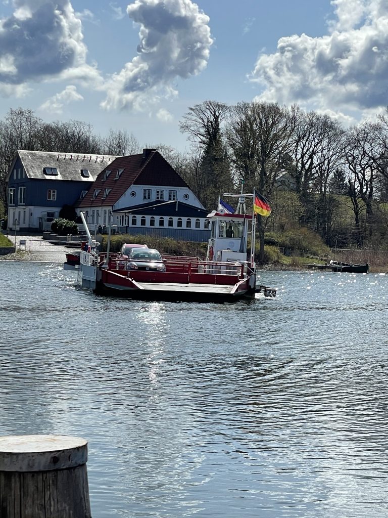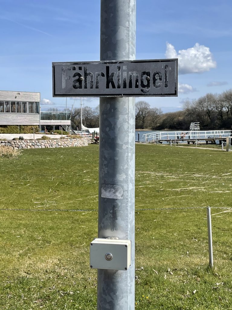 Wir halten noch an der Schleifähre in Missunde, die wir sonst nur vom Wasser aus kennen. Das ist der erste Fähranleger, an dem wir eine Klingel für die Fähre sehen.