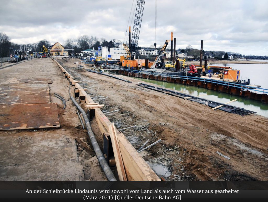 Die knapp 100 Jahre alte Schleibrücke (für PkW, LkW, Fußgänger und die Bahn) gehört zu den schönsten technischen Bauwerken Schleswig-Holsteins. Aber eine weitere Instandsetzung wäre zu teuer. Nun kommt ein Neubau. Dafür wird nun schon seit längerem kräftig rund um die alte Brücke gebaut. Aktuell wird vermutet, dass sich das alte Bauwerk durch die Baumaßnahmen verzogen hat und deshalb nicht mehr korrekt schließt. Zur Zeit haben sie die Brücke sicher verriegeln können und wollen sie nicht mehr öffnen, bis der Fehler gefunden und behoben ist.