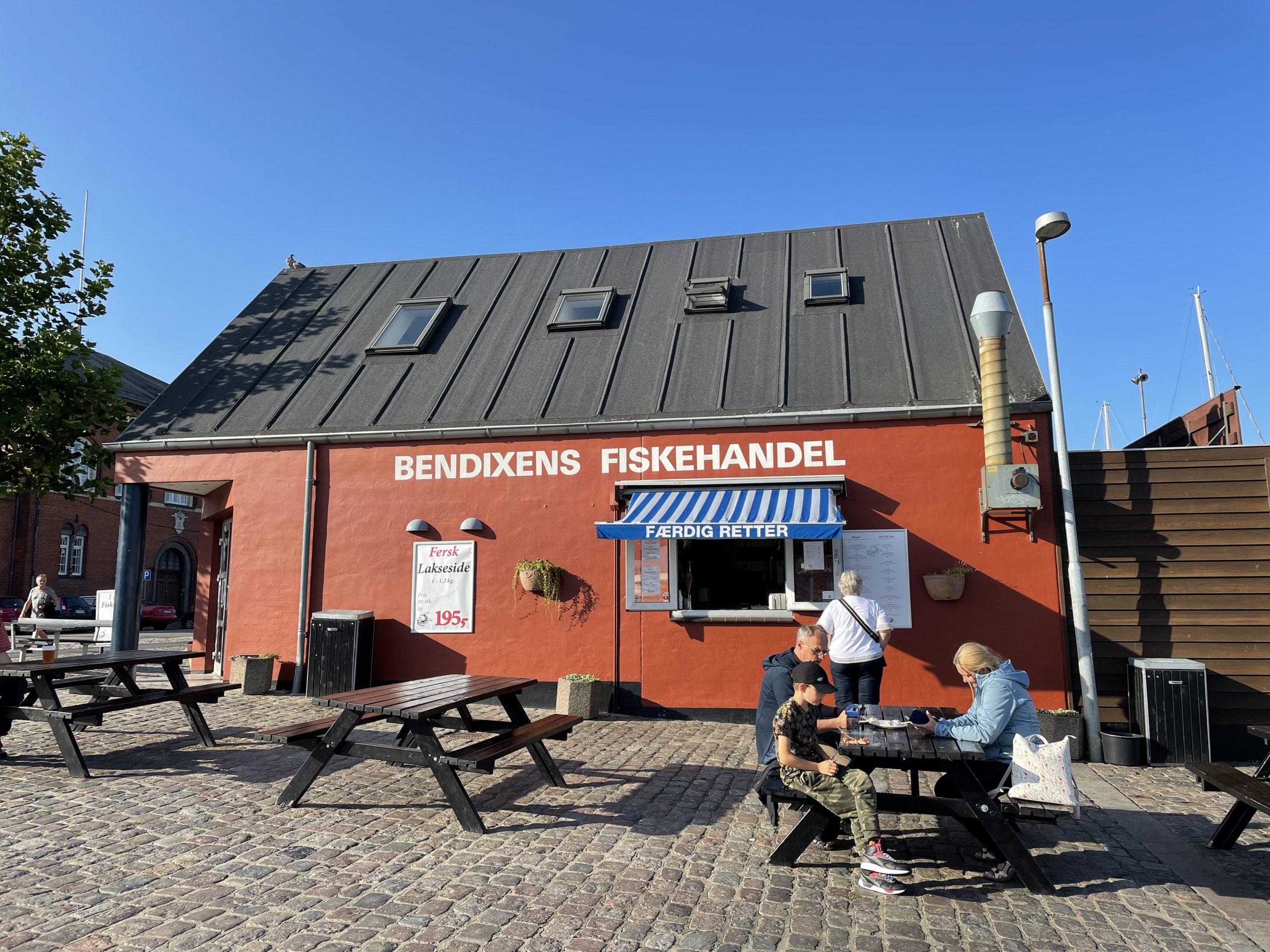 Pünktlich um 17.26h fährt der Zug aus Odense im Bahnhof Svendborg ein – die Anreise aus Hannover hat prima geklappt. Zur Stärkung nach der Reise genießen wir leckeren Fisch von der Fischbude am Hafen: Bendixens Fiskehandel ist nicht nur Anbieter von frischem Fisch, sondern auch Grillstation von leckeren warmen Gerichten.