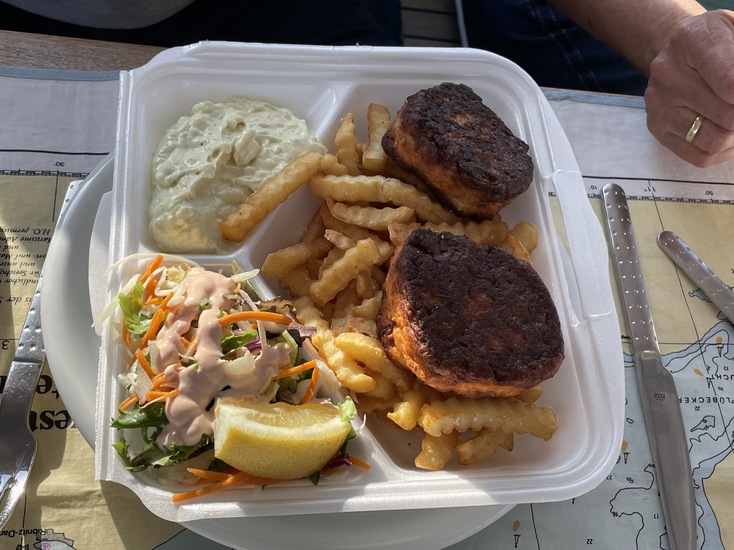 Zum Abendessen genießen wir Fisch aus der Fischhalle am Fischereihafen (sehr zu empfehlen und deutlich leckerer als von Gosch am Yachthafen) und gehen früh zu Bett – morgen wollen wir wirklich zeitig starten.