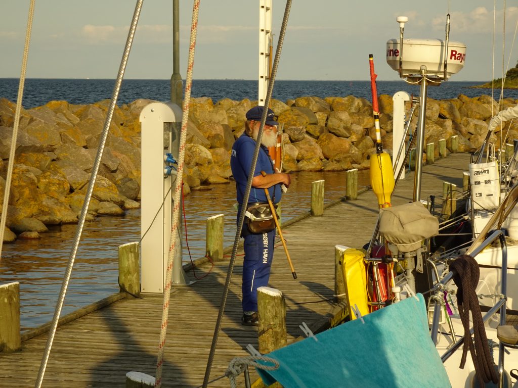 Sonntag, 22.08.21 Endlich ist mal ausschlafen angesagt – Überschrift ist schließlich: Urlaub.Wir haben beschlossen, einen Tag hier in Bagenkop zu bleiben und mal zum Langelands Fort zu radeln. Vorher ist allerdings Hafenkino angesagt: der Wind hat ein wenig zugelegt und einige Segler mühen sich redlich, bei auflandigem Wind von der Mole wegzukommen. Kalli mit seiner Erfahrung gibt den einen oder anderen Manövertipp: z.B. eine Spring legen (z.B. von der achterlichen Klampe des Schiffes nach etwa mittschiffs an Land), die entspr. Schiffsseite gut abfedern und in die Spring eindampfen (Rückwärtsgang, Ruder einschlagen und Gas geben) und das Schiff dreht sich dann mit dem Bug ganz langsam von der Mole weg… klappt auch ohne Bugstrahlruder! Die Tipps werden auch immer gerne angenommen.