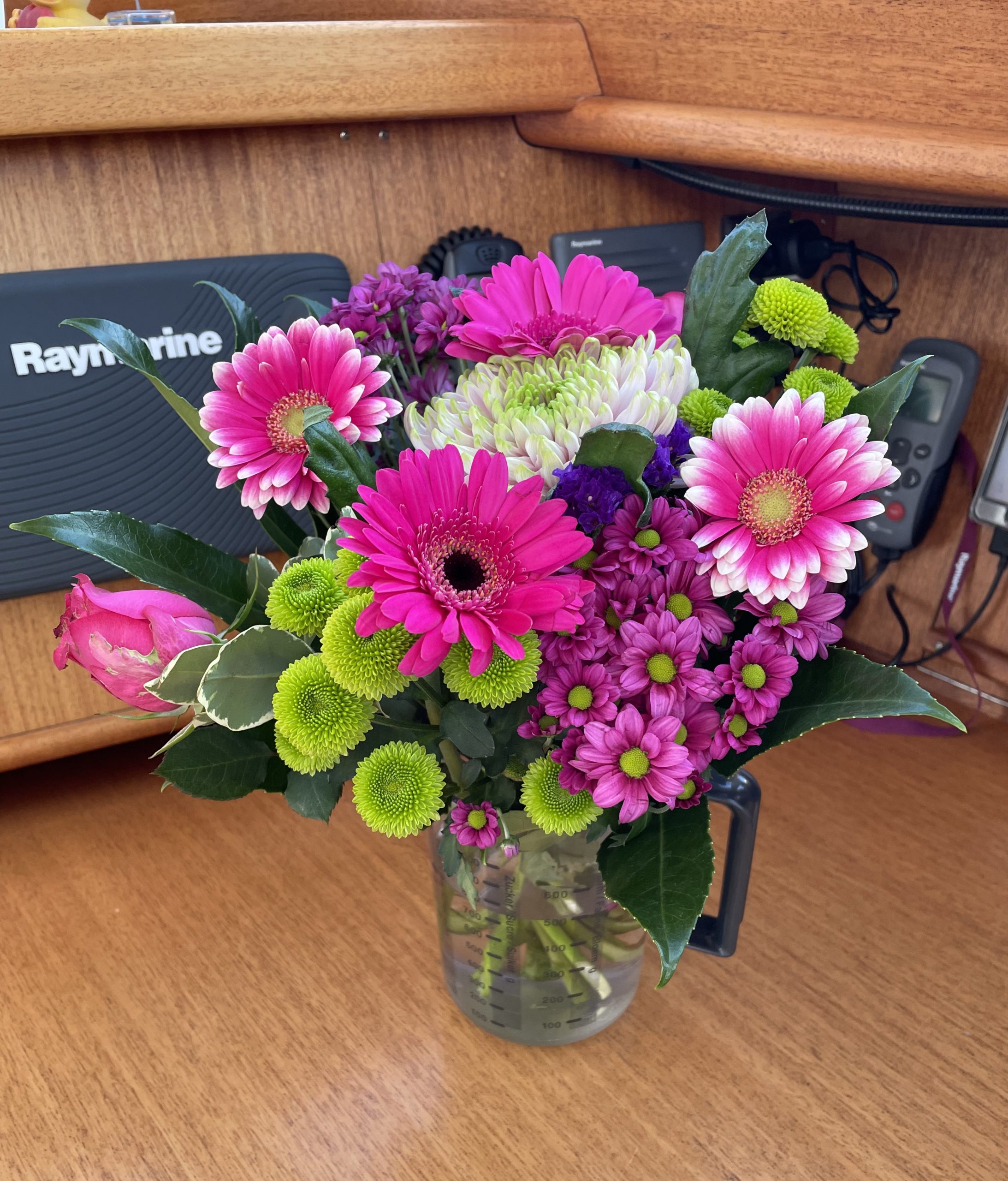 Für Dienstag, den 31.08.21 ist nur eine kurze Etappe vorgesehen: es soll nur bis Bagenkop an der Südküste Langelands gehen. Doch zuerst: ausschlafen und dann ein ausgiebiges Frühstück – mit Blumen und Prickelwasser! Petra hat Geburtstag. Anschließend tuckern wir unter Motor nach Bagenkop – der Wind ist leider noch im Tiefschlaf. Dort angekommen genießen wir den herrlichen Sommertag.