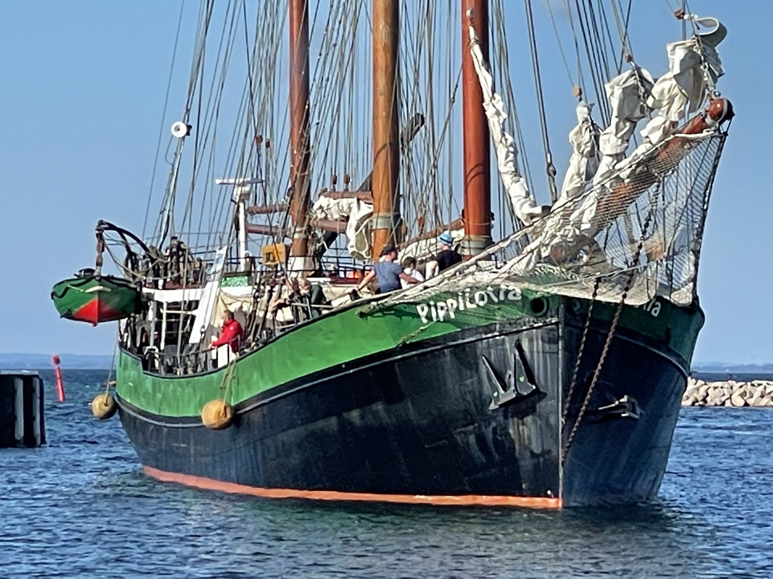 Am nächsten Tag, Montag, den 30.08.21, geht es nun aber weiter. Der Sommer scheint zurück! Das nächste Etappenziel ist Marstal an Ærøs Südküste und es wird ein fantastischer Segeltag. Der Wind hat mit 4 Beaufort die ideale Stärke für entspanntes Segeln. Er weht schön gleichmäßig, mal von einigen Böen abgesehen und da wir an der Westküste Ærøs heruntersegeln und der Wind aus Nordost weht, haben wir relativ ruhiges Wasser, also kaum Wellengang, da das Land uns Schutz gibt. Unsere Gäste danken uns das ruhige Wasser und die nicht so schaukelige Schiffsbewegung und können den Segeltag richtig genießen. Unsere schnellste Geschwindigkeit an diesem Tag: berauschende 8,9 Knoten – gemessen über Grund und nicht etwa mit Strömung mit uns! Heute merken wir mal so richtig, was so toll an unseren neuen Epex-Segeln ist: wenn eine Böe ins Segel fällt, wird diese sofort in Vorwärtsbewegung umgesetzt. Das Segelmaterial ist so steif, dass es dem Wind nicht nachgibt . Unsere alten Dacron-Segel, schon mit einem kleinen Bauch gesegnet (also über die Jahre etwas ausgeleiert) haben diese Böe in Schräglage umgesetzt. Das war natürlich bei Weitem nicht so angenehm wie jetzt dieser Geschwindigkeitsgewinn. Wir sind begeistert! Das Schiff fährt wie auf Schienen!