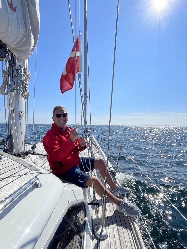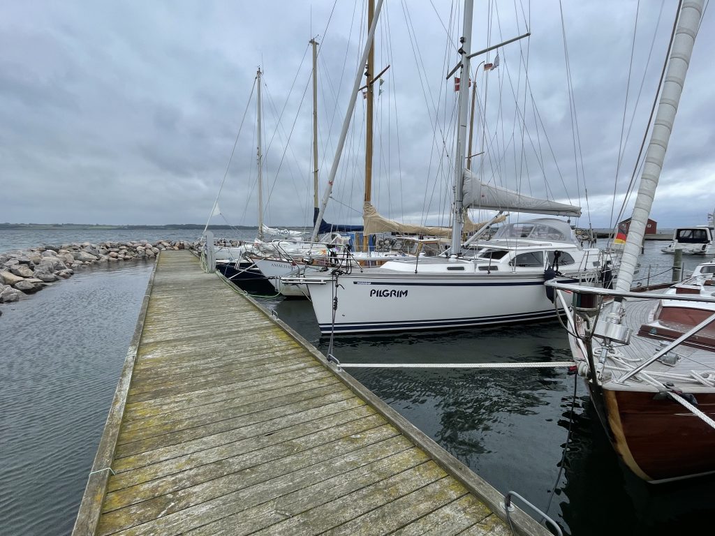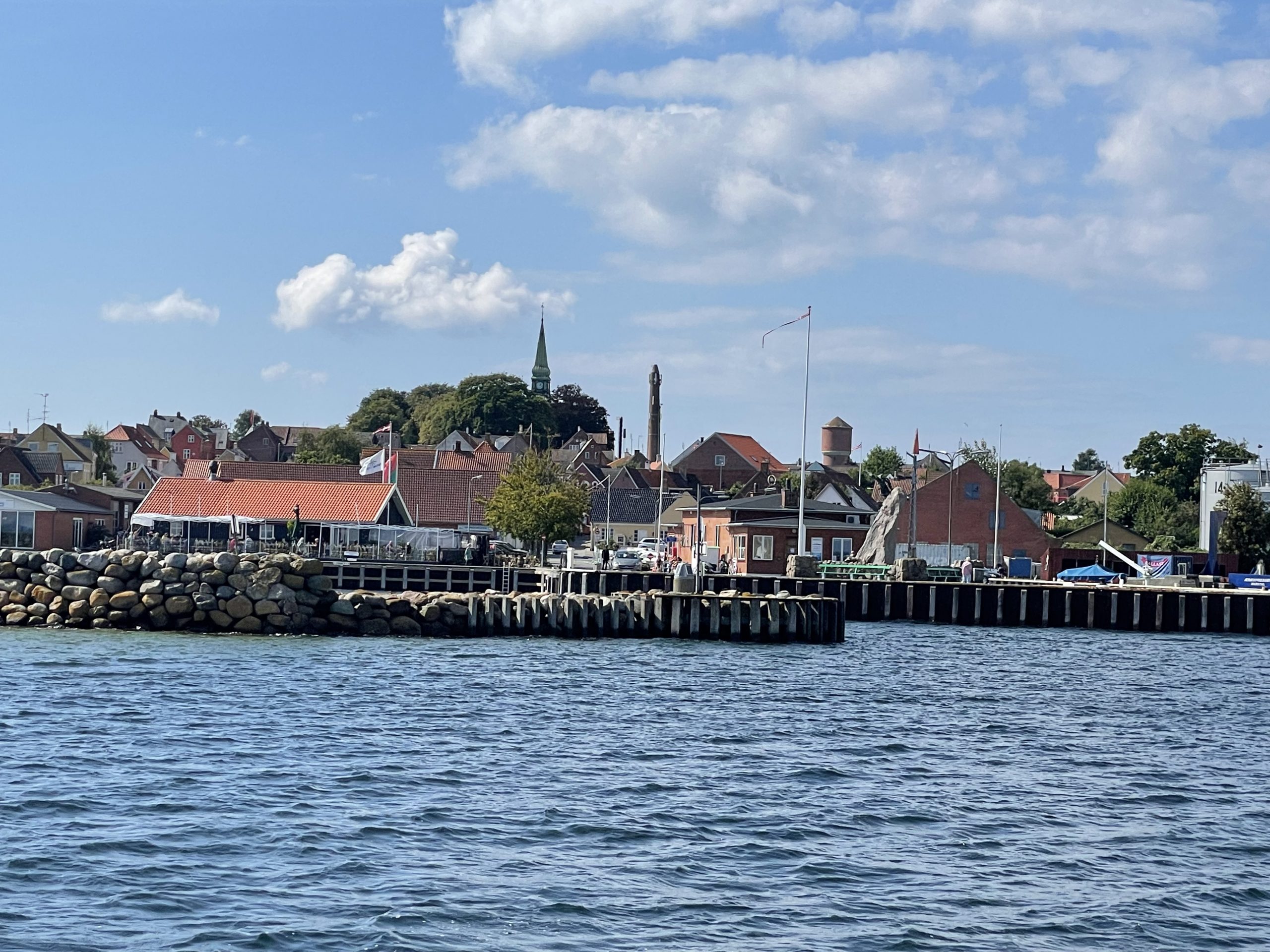 Am nächsten Tag, Montag, den 30.08.21, geht es nun aber weiter. Der Sommer scheint zurück! Das nächste Etappenziel ist Marstal an Ærøs Südküste und es wird ein fantastischer Segeltag. Der Wind hat mit 4 Beaufort die ideale Stärke für entspanntes Segeln. Er weht schön gleichmäßig, mal von einigen Böen abgesehen und da wir an der Westküste Ærøs heruntersegeln und der Wind aus Nordost weht, haben wir relativ ruhiges Wasser, also kaum Wellengang, da das Land uns Schutz gibt. Unsere Gäste danken uns das ruhige Wasser und die nicht so schaukelige Schiffsbewegung und können den Segeltag richtig genießen. Unsere schnellste Geschwindigkeit an diesem Tag: berauschende 8,9 Knoten – gemessen über Grund und nicht etwa mit Strömung mit uns! Heute merken wir mal so richtig, was so toll an unseren neuen Epex-Segeln ist: wenn eine Böe ins Segel fällt, wird diese sofort in Vorwärtsbewegung umgesetzt. Das Segelmaterial ist so steif, dass es dem Wind nicht nachgibt . Unsere alten Dacron-Segel, schon mit einem kleinen Bauch gesegnet (also über die Jahre etwas ausgeleiert) haben diese Böe in Schräglage umgesetzt. Das war natürlich bei Weitem nicht so angenehm wie jetzt dieser Geschwindigkeitsgewinn. Wir sind begeistert! Das Schiff fährt wie auf Schienen!