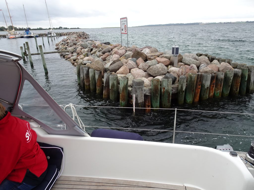 Kurz vor dem Einlaufen in Lyø läßt der Wind glücklicherweise auf ca. 4 Beaufort nach, denn die Hafeneinfahrt ist bannig eng und Wind und Welle stehen genau drauf. Kallis Erfahrung ist gefordert… und „eigentlich“ ist heute auch viel Platz. Bei unserem ersten Einlaufen hier vor einigen Jahren lag in der Einfahrt noch ein kleinerer Traditionssegler und machte die Einfahrt noch schmaler. Damals wären wir am liebsten umgekehrt. Es sah nicht so aus, als wenn wir hineinpassen würden. Aber es war kaum Wind und so haben wir es mutig probiert. Hat auch geklappt. Heute auch.