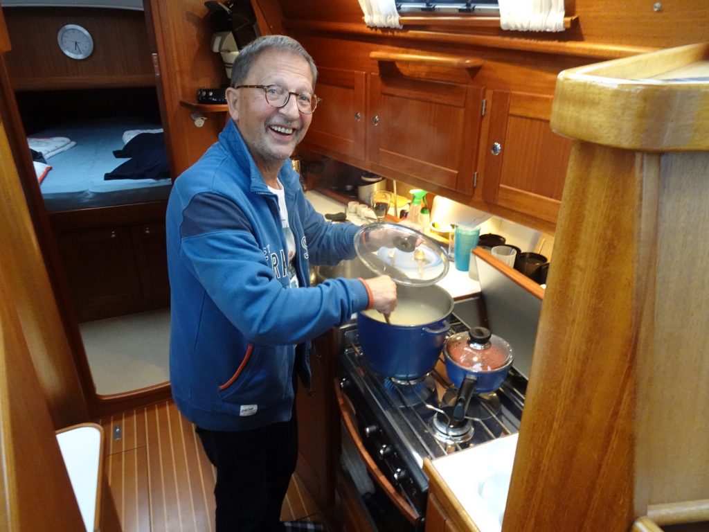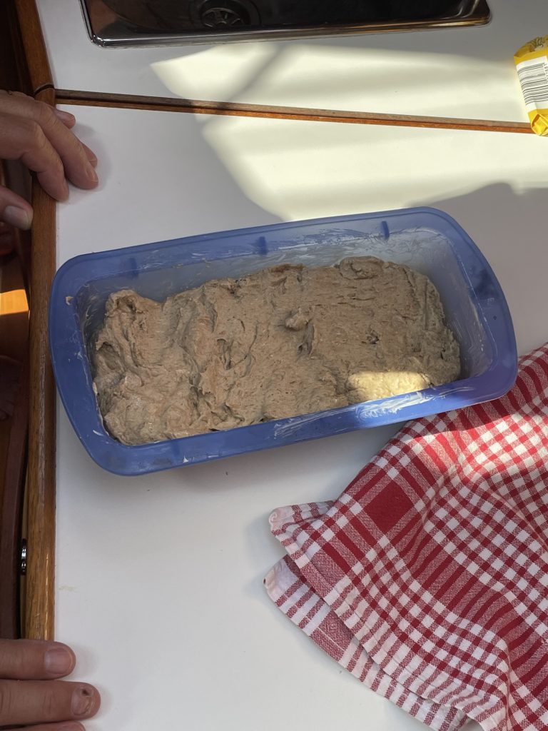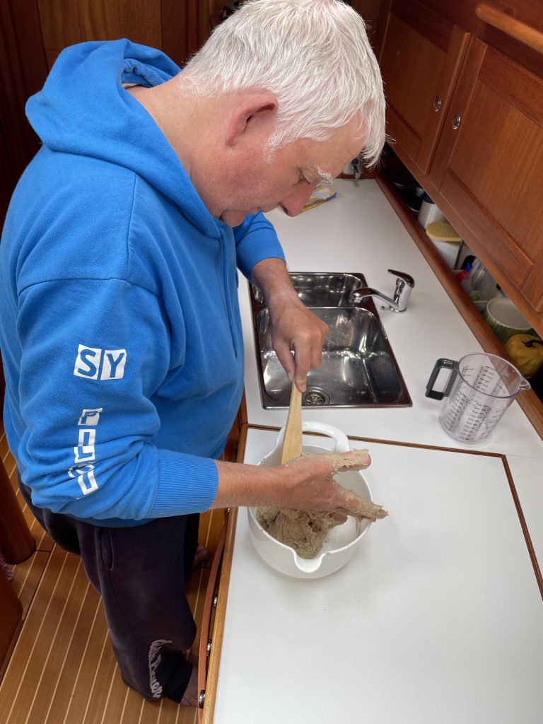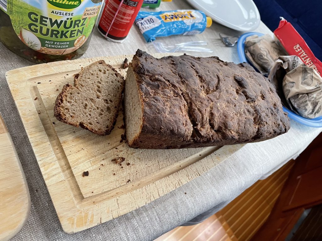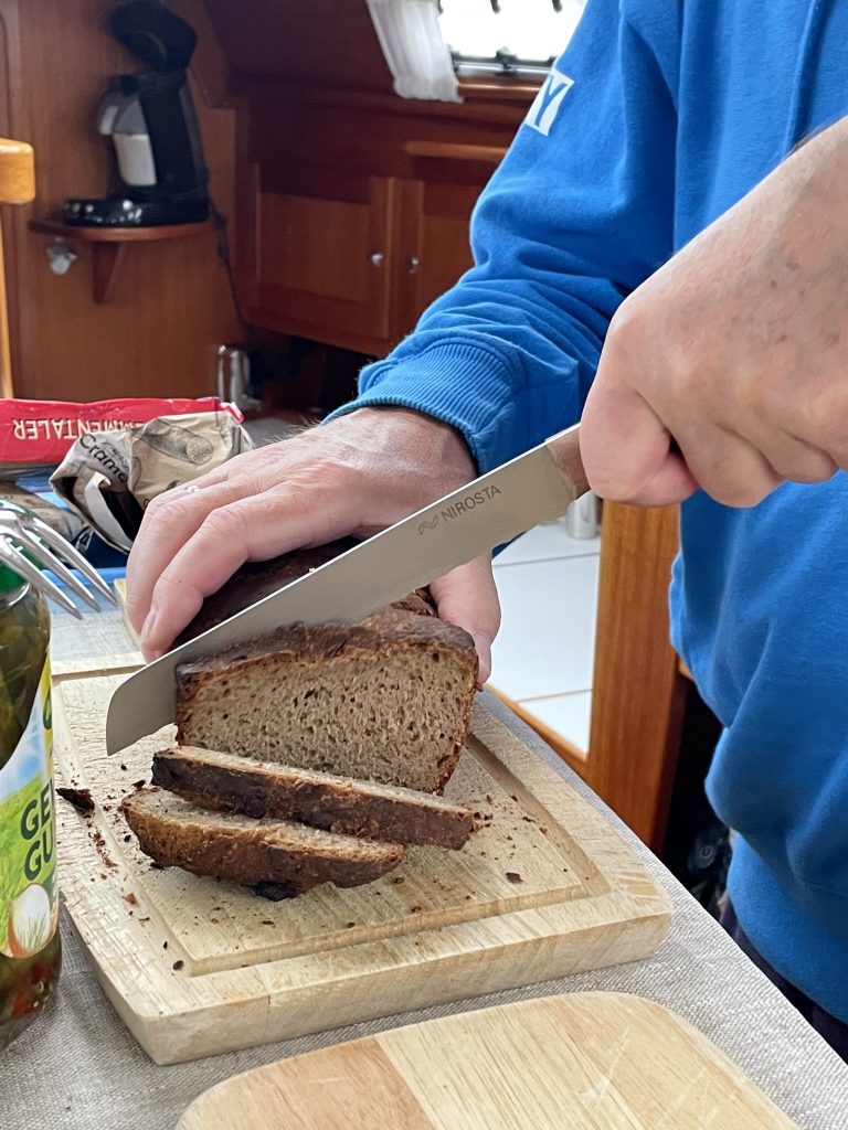 Am Sonntag, 29.08.21 ist ausschlafen angesagt. Dann wieder das Wetter mit Wolfgang: „da hinten wird es heller… kann aber ein bisschen dauern.“ Wir entscheiden, einen Tag hier zu bleiben und das nieselige Wetter und 5 Beaufort Wind auszusitzen. Während Gerlinde + Wolfgang noch einen Spaziergang über die Insel unternehmen, betätigt sich Kalli als Bäcker. Wir haben verschiedenen Backmischungen an Bord und eine muß jetzt ran. Kneten… gehen lassen… in Backform geben und wieder gehen lassen… dann backen… mmhhh lecker! Das Abendessen ist gerettet!