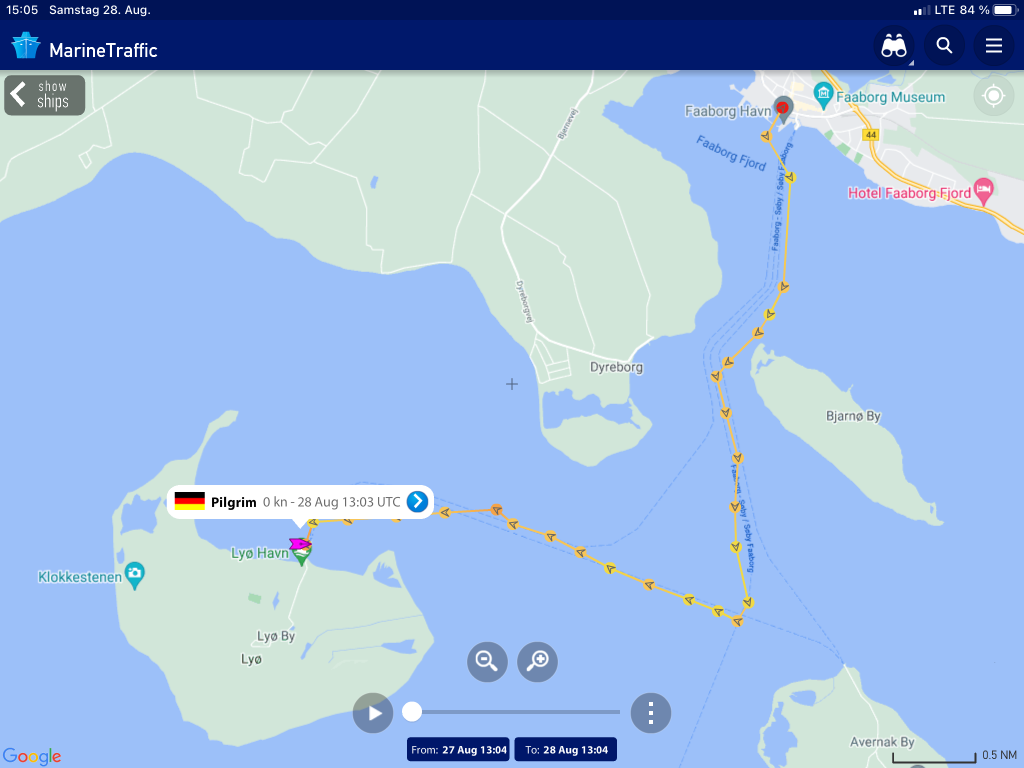 Am Samstag, 28.08.21 warten wir vormittags erst noch einige Schauer ab und starten dann auf die kurze Etappe nach Lyø. Aber vorher: erst noch das Wetter mit Wolfgang: „da hinten wird es heller!“ Das wird in den nächsten Tagen ein geflügeltes Wort. Wir legen ab und segeln wieder nur unter Vorsegel gen Lyø. Das klappt ganz gut, denn bei dem achterlichen Wind fahren wir die eine oder andere Halse – gehen also mit dem Heck durch den Wind. Das wäre mit gesetztem Großsegel und bei der aktuellen Windstärke nicht so ratsam. Zwischenzeitlich briest der Wind für einige Zeit auf 24 Knoten = gut 6 Beaufort auf. Da wäre bei unserem riesigen Großsegel längst reffen angesagt. Grad bei dieser Rauschefahrt bei viel Wind werden wir von einem großen Dreimaster begleitet – allerdings dieser nur unter Maschine. Es ist die Georg Stage auf dem Weg nach Norwegen.