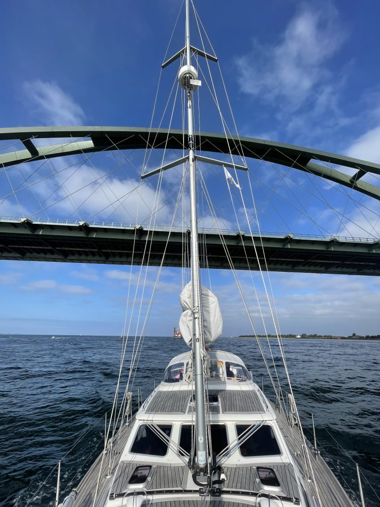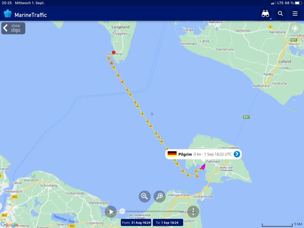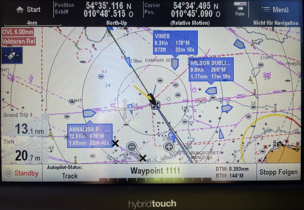 Am Mittwoch, den 01.09.21 führt ins unser Kurs wieder nach Deutschland. Die Sonne gibt Alles und strahlt wie in besten Sommerzeiten. Aber der Wind… leider nur recht schwach und das auch noch direkt von Achtern. Wir kommen, trotz Bemühungen, nicht wirklich von der Stelle. 2,5kn Geschwindigkeit ist nicht unser bevorzugtes Reistempo. Nach einiger Zeit geben wir auf und starten den Motor. Nun haben wir zwar das monotone Geräusch unserer Unterwasser-Genua zu ertragen, aber so schlimm ist es nun auch wieder nicht… und wir kommen wenigstens voran.