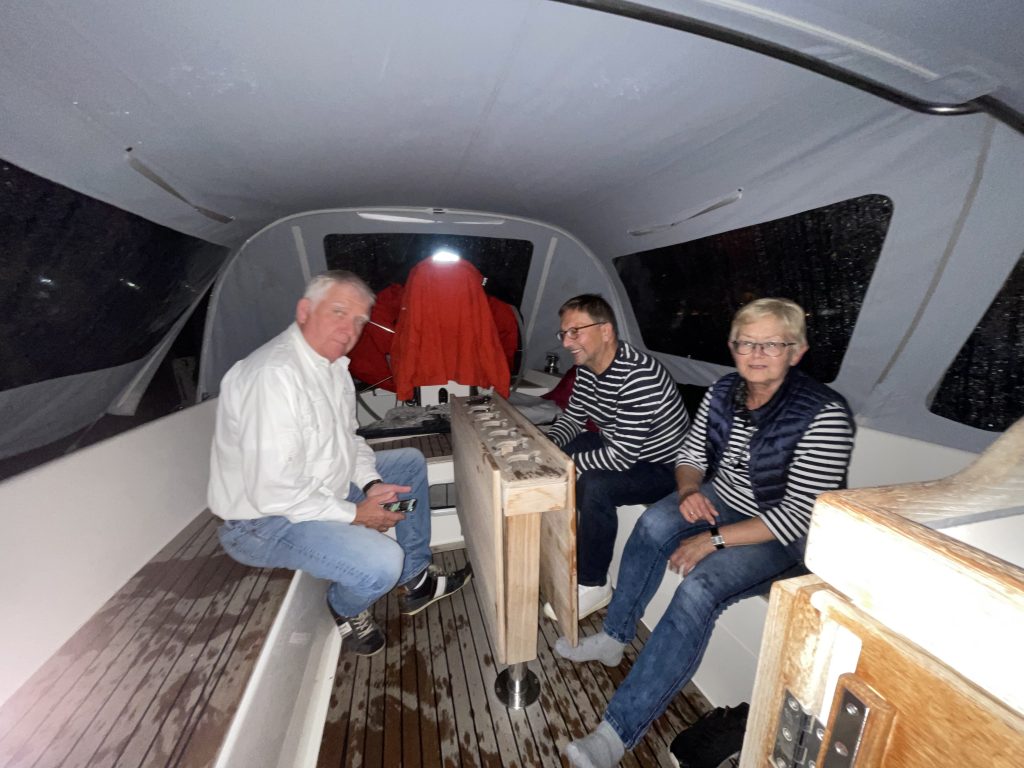 Donnerstag, 26.08.21 Die erste Nacht haben unsere Gäste schon mal gut geschlafen – doch leider ist das Wetter irgendwie ungemütlich. Gerlinde und Wolfgang haben uns in der Vergangenheit schon mehrfach für einige Tage an Bord besucht, daher kennen sie sich auf dem Schiff gut aus und fühlen sich auch gleich heimisch. Hätte aber nicht einfach die Sonne weiter scheinen können? Hätte nicht einfach der Wind bei gemütlichen 3 Beaufort bleiben können? Ein Schauer jagt den Nächsten und 5-6 Beaufort sind auch nicht unsere bevorzugte Windstärke… und schon garnicht mit Gästen.
