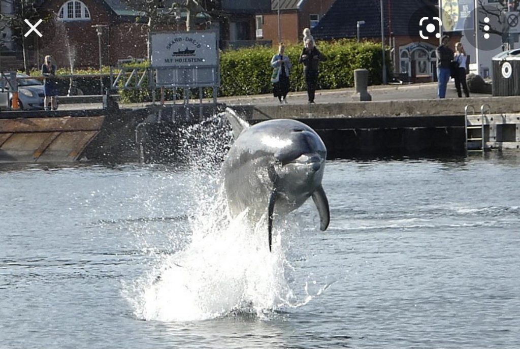 Übrigens lebt seit ca. zwei Jahren ein Delfin – kein Schweinswal, sondern wirklich ein Delfin bzw. Großer Tümmler/ Tursiops Truncatus – in der Umgebung von Svendborg. Jetzt im nachhinein wissen wir, dass der vermeintliche Schweinswal, der auf der Hinfahrt nach Svendborg unter uns hindurch getaucht ist, dieser Delfin war. Denn er war für einen Schweinswal schon bannig groß. Also „Delle“, wie ihn die Svendborger liebevoll nennen, ist ein Delfinmännchen mit ca. 3,80m Länge und ca. 550kg Gewicht. Wir sehen ihn an einem Nachmittag von unserem Liegeplatz aus bestimmt 15min. lang Sprünge machen und in der Hafeneinfahrt herumtollen. Die Fotos sind allerdings nicht selbstgemacht.