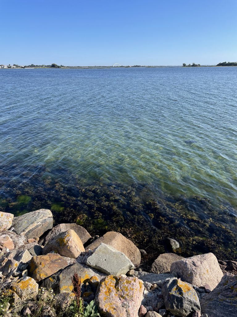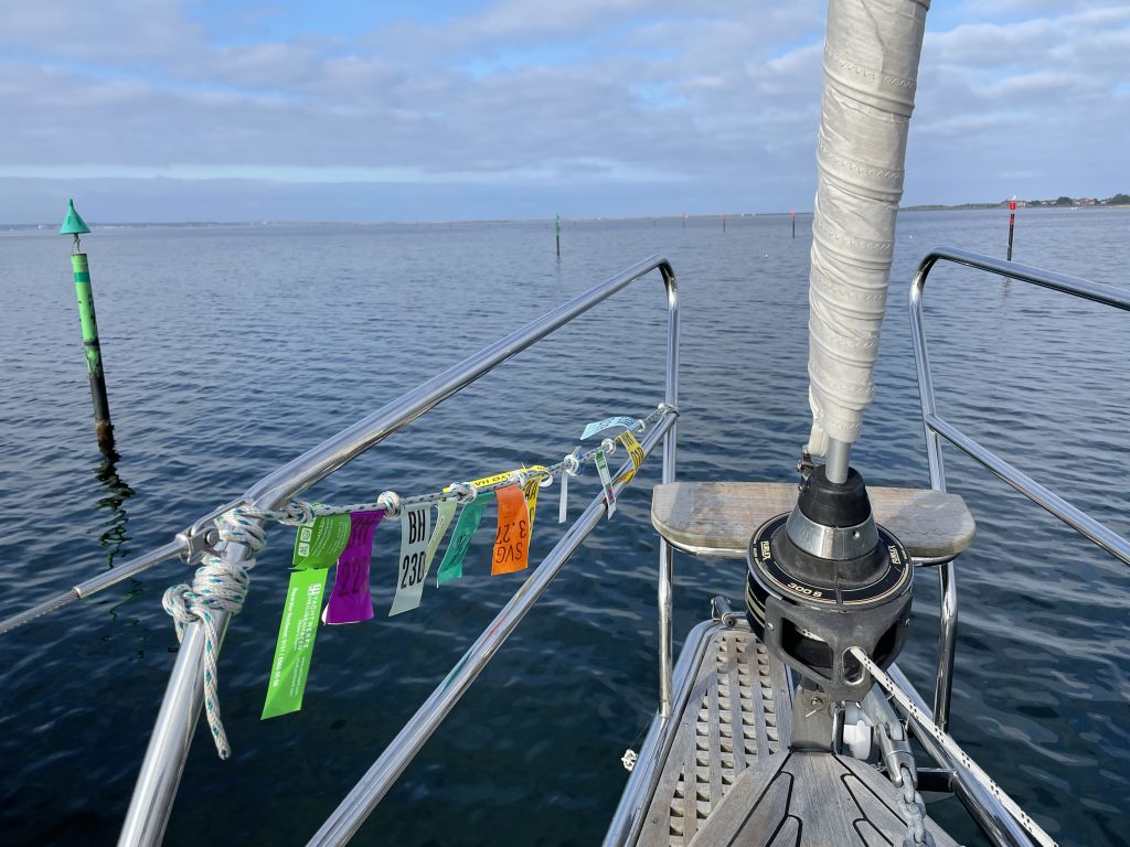 Der letzte Segeltag bricht am Donnerstag, den 02.09.21 mit etwas Bewölkung an. Wolfgang meint zwar: „dort hinten wird es hell“, aber so richtig klappt das noch nicht. Wir tuckern gemütlich den schmalen betonnten Weg aus Lemkenhafen raus… kein Windhauch kräuselt die Wasseroberfläche und wir können bei dem glatten und klaren Wasser bis auf den Grund gucken. Kleine Fische, hier und da eine Qualle und Seegras… alles da und gut zu sehen.