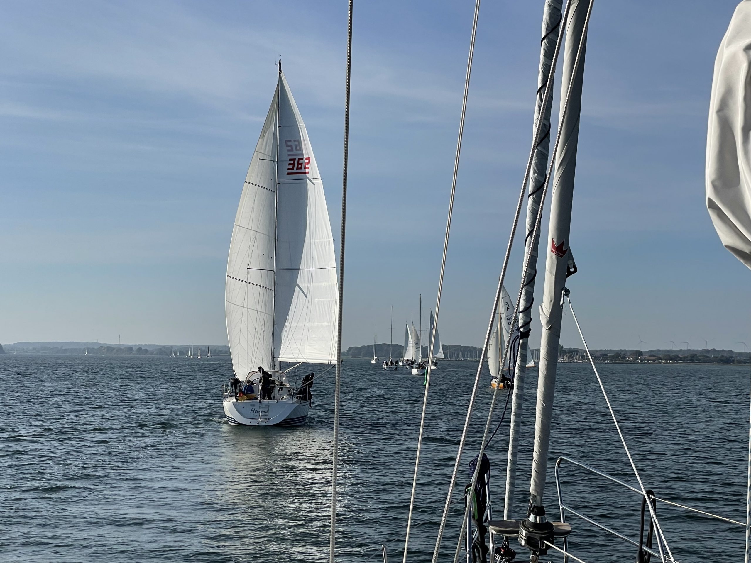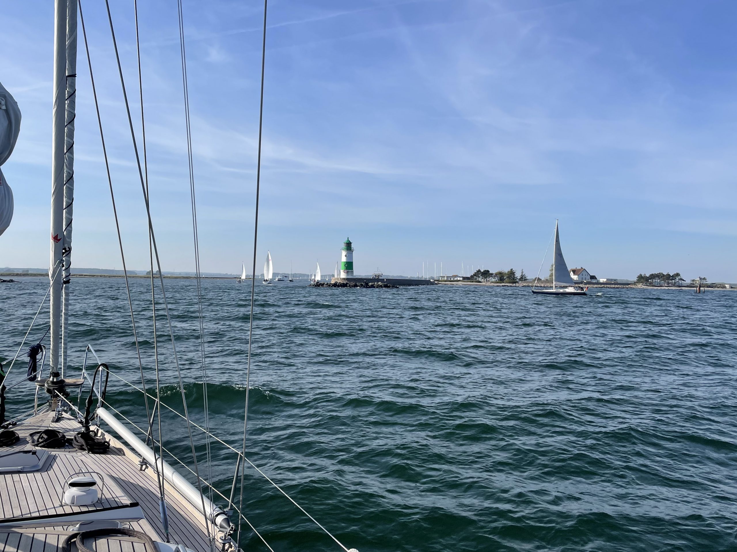 Windstärke und -richtung erweisen sich als ideal, um unser großes Vorsegel, den Code Zero, nochmal auszupacken. Genial. Bei nur gut 5 Knoten Wind (ca. 2 Beaufort, also recht wenig) ca. 5 Knoten Schiffsgeschwindigkeit zu erreichen ist wirklich nicht schlecht. So gleiten wir also gemütlich – bei Sonne! – nach Heiligenhafen. Für den Weg unter der Fehmarnsund-Brücke muss das Segel zwar eingepackt werden, aber wir lassen es am Mast angeschlagen, um es ggf. am nächsten Tag nochmal auszuwickeln. Eine gute Entscheidung.