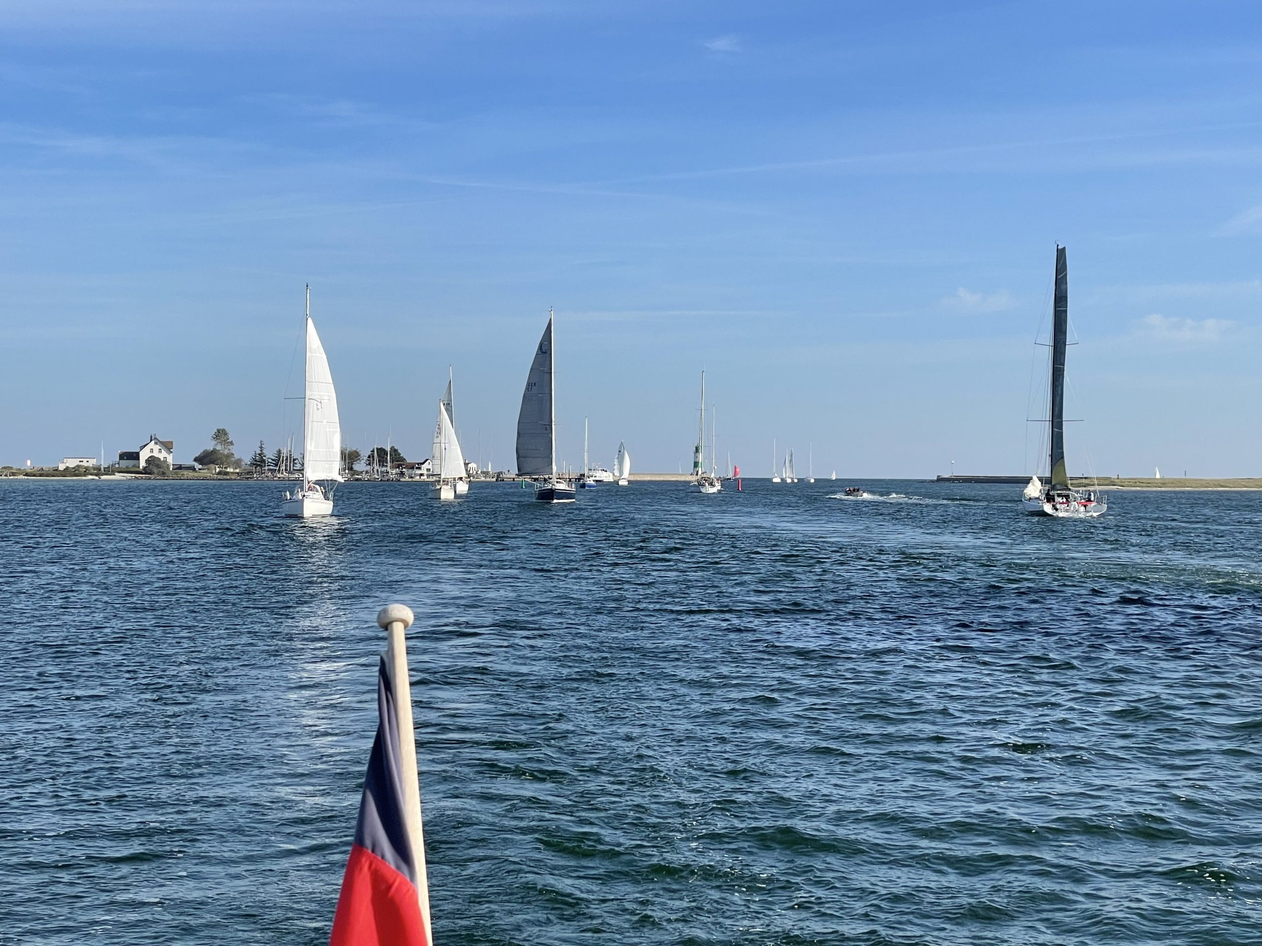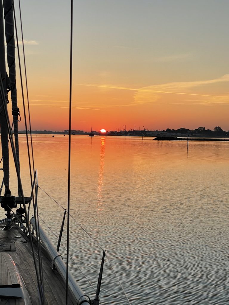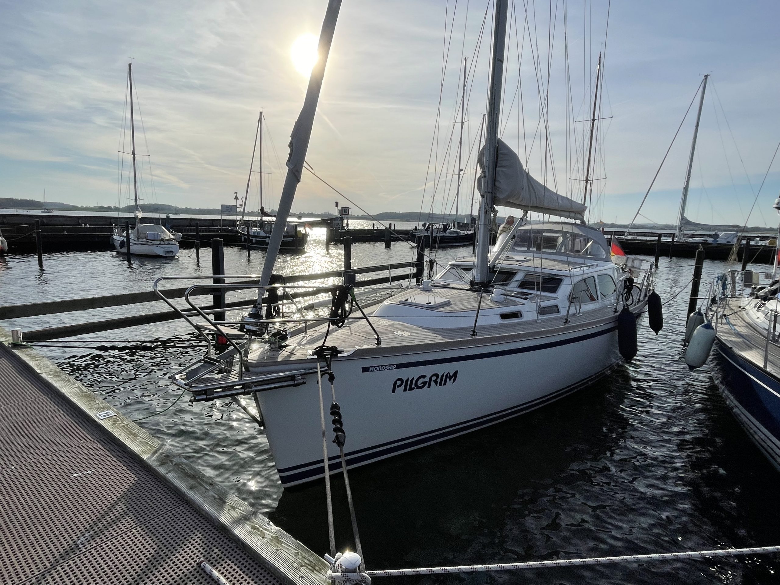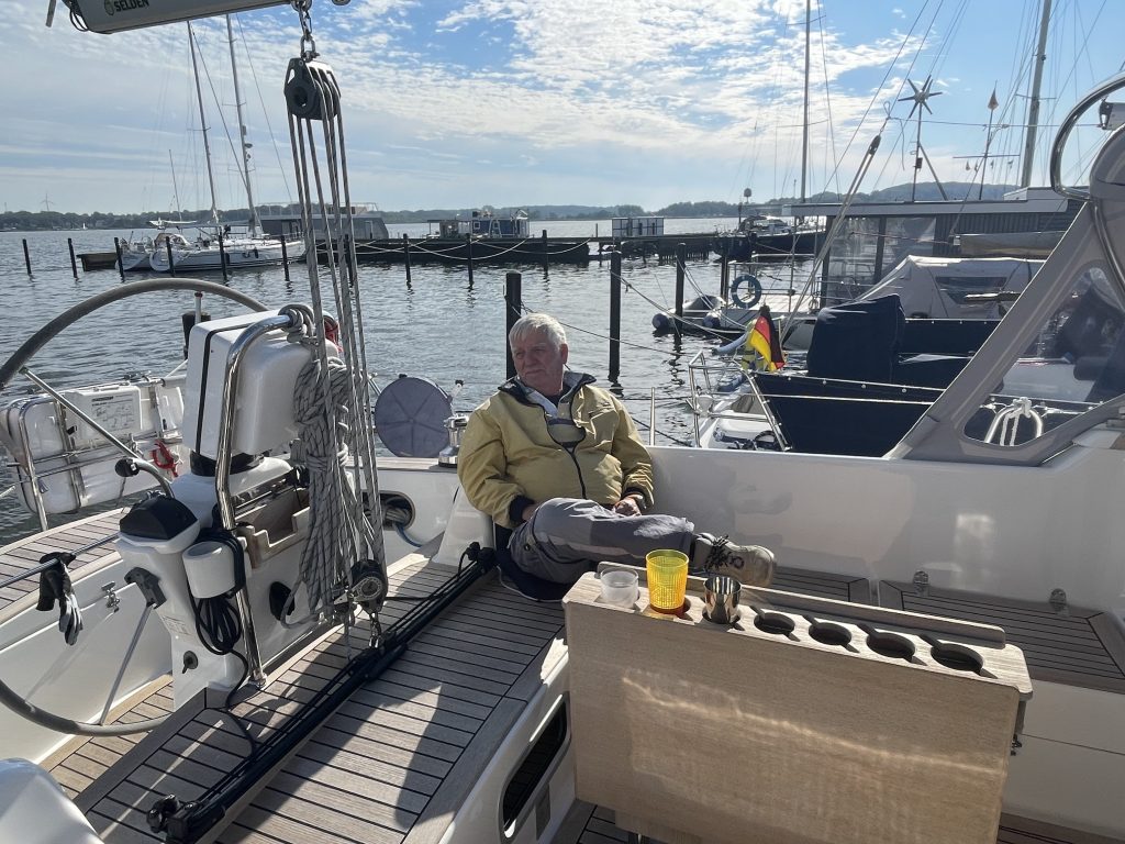 Wir machen in Maasholm fest und gönnen uns einen leckeren Einlaufdrink in der Sonne. Geplant war ursprünglich, noch die Brücke bei Kappeln zu passieren, um am nächsten Tag die Brückenöffnung Lindaunis besser abzupassen. Doch jetzt scheint die Sonne, wir haben einen prima Liegeplatz, Wind direkt von vorne und daher heißt es: all hands on deck, Code Zero im Segelstaufach verpacken und das Großsegel abschlagen. Klappt alles prima und so geht der zweite Tag vom Saisonende erfolgreich zu Ende.