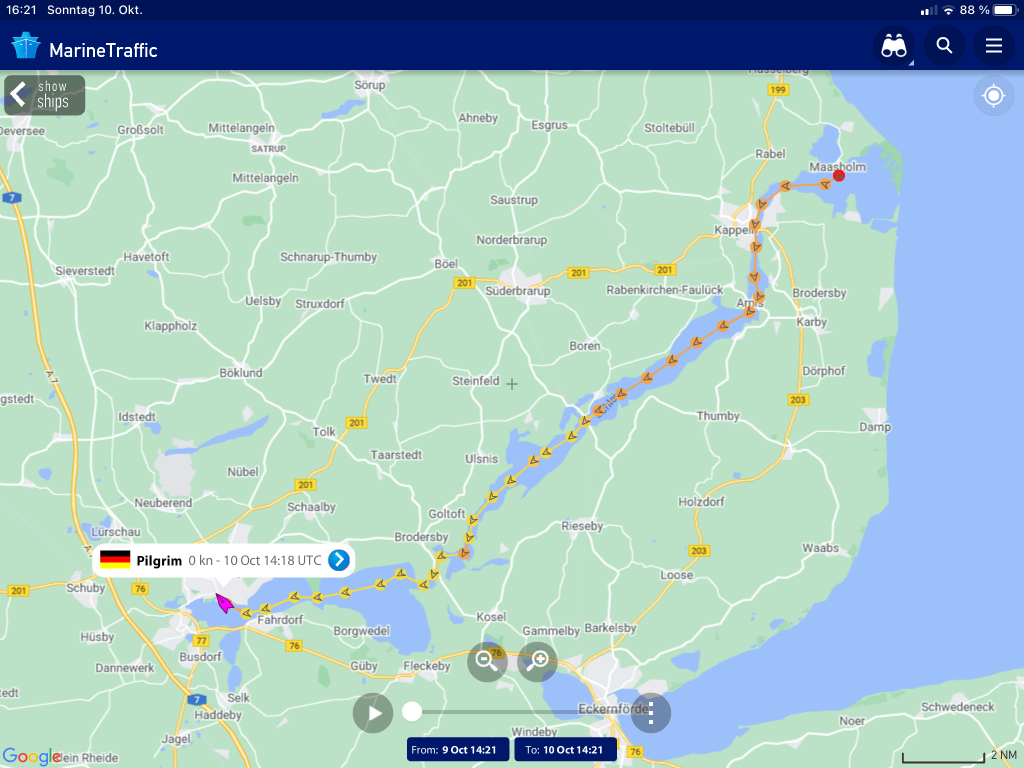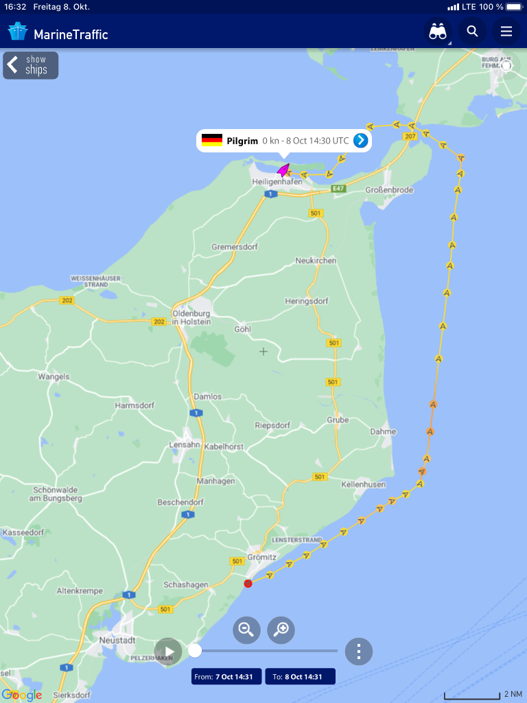 Freitag, 08.10.2021 Nun ist die Saison zu Ende. Wir machen uns auf den Weg von Grömitz… nach Heiligenhafen… nach Maasholm… nach Schleswig.