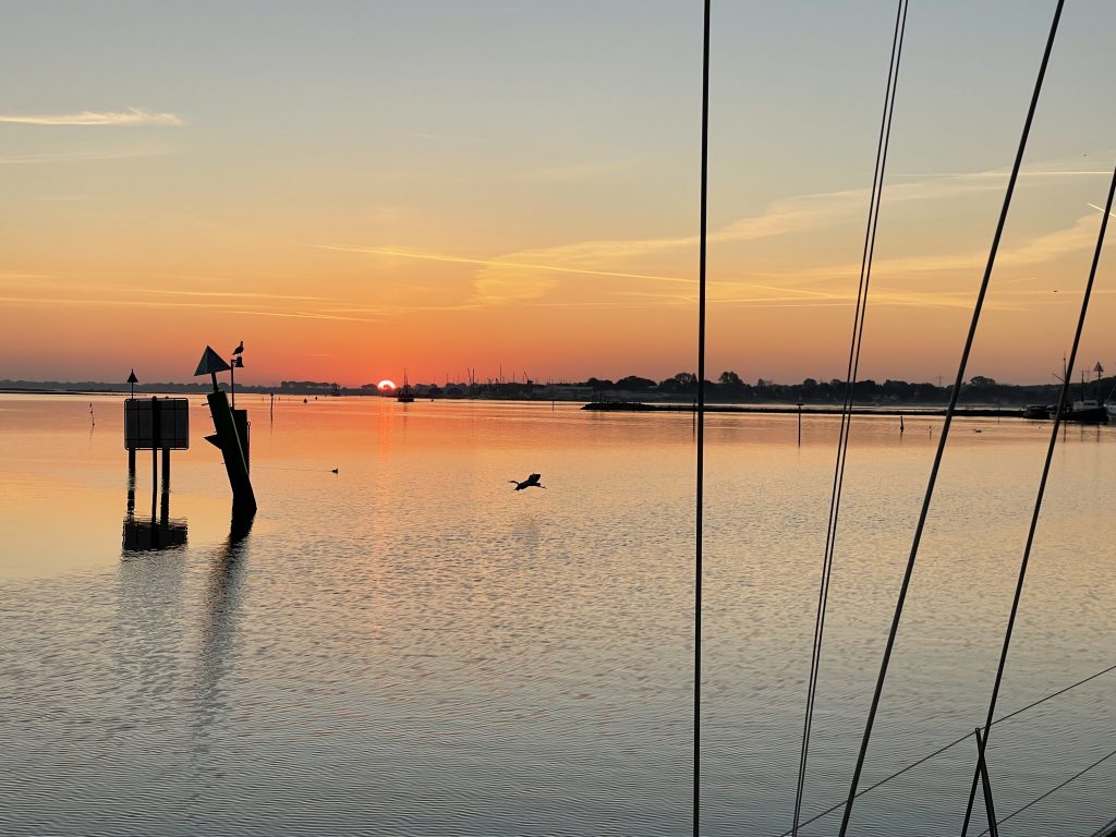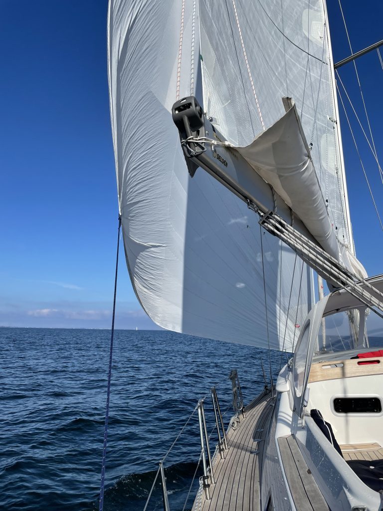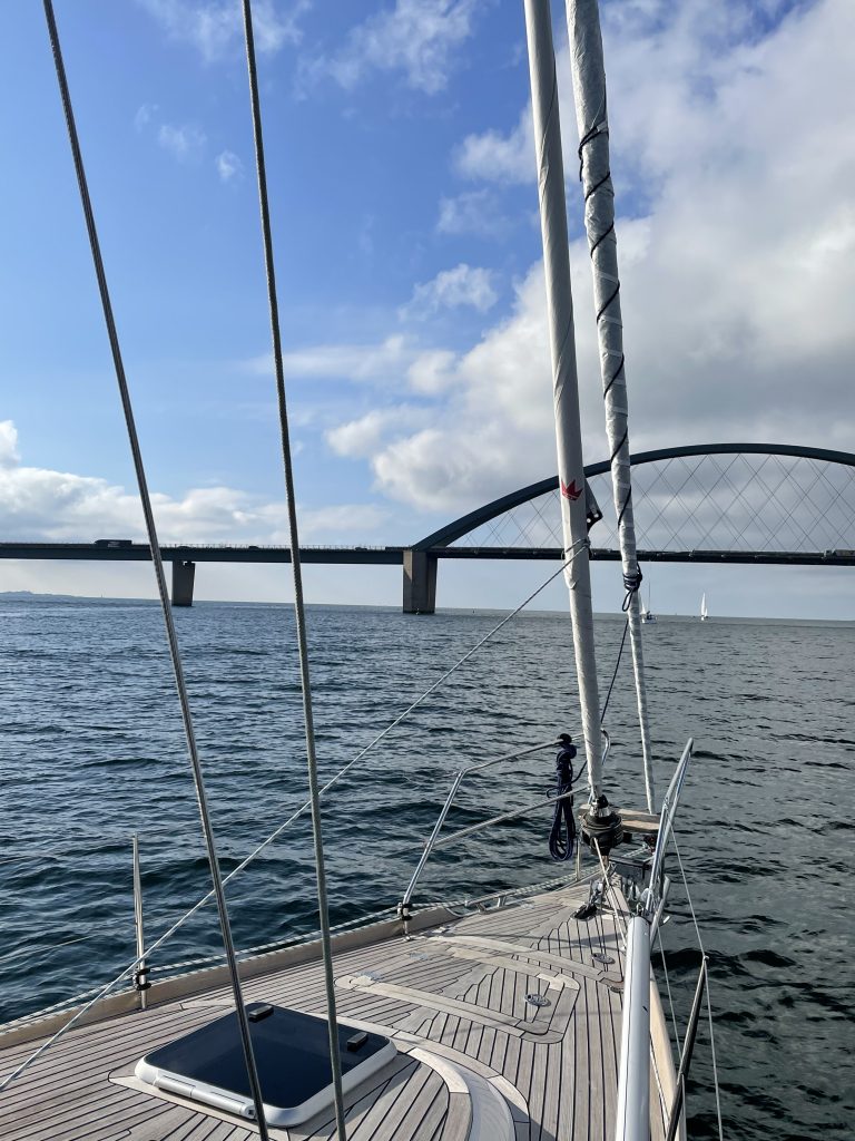 Windstärke und -richtung erweisen sich als ideal, um unser großes Vorsegel, den Code Zero, nochmal auszupacken. Genial. Bei nur gut 5 Knoten Wind (ca. 2 Beaufort, also recht wenig) ca. 5 Knoten Schiffsgeschwindigkeit zu erreichen ist wirklich nicht schlecht. So gleiten wir also gemütlich – bei Sonne! – nach Heiligenhafen. Für den Weg unter der Fehmarnsund-Brücke muss das Segel zwar eingepackt werden, aber wir lassen es am Mast angeschlagen, um es ggf. am nächsten Tag nochmal auszuwickeln. Eine gute Entscheidung.