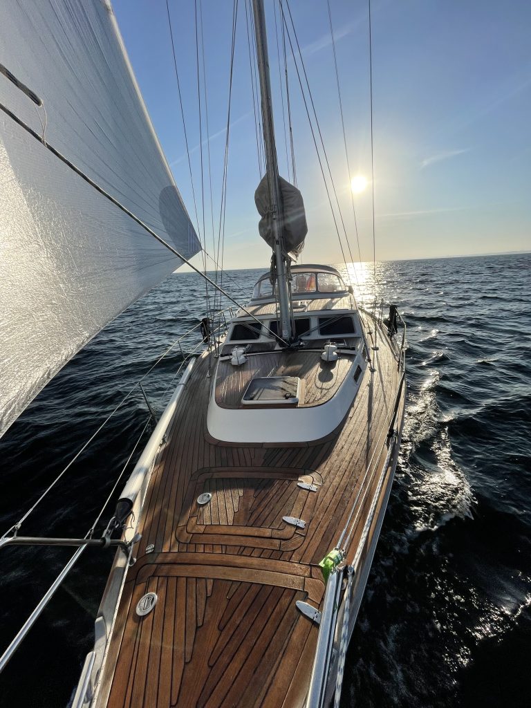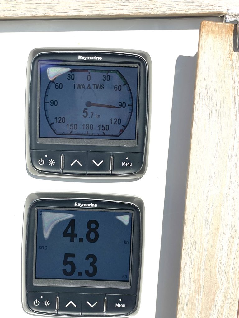 Am nächsten morgen geht es nun aber doch früh los – bei Sonnenaufgang um 07.33h sind wir schon unterwegs. Die erste Zeit können wir segeln (es lebe der Code Zero), doch dann kommt der Wind recht schwach direkt von achtern und wir müssen die Unterwasser-Genua – unseren Motor, genannt auch Jockel – bemühen.