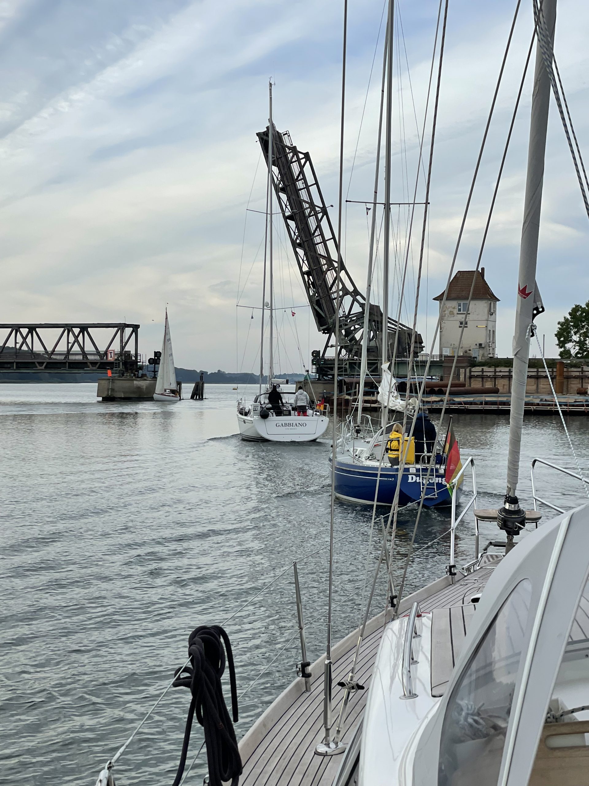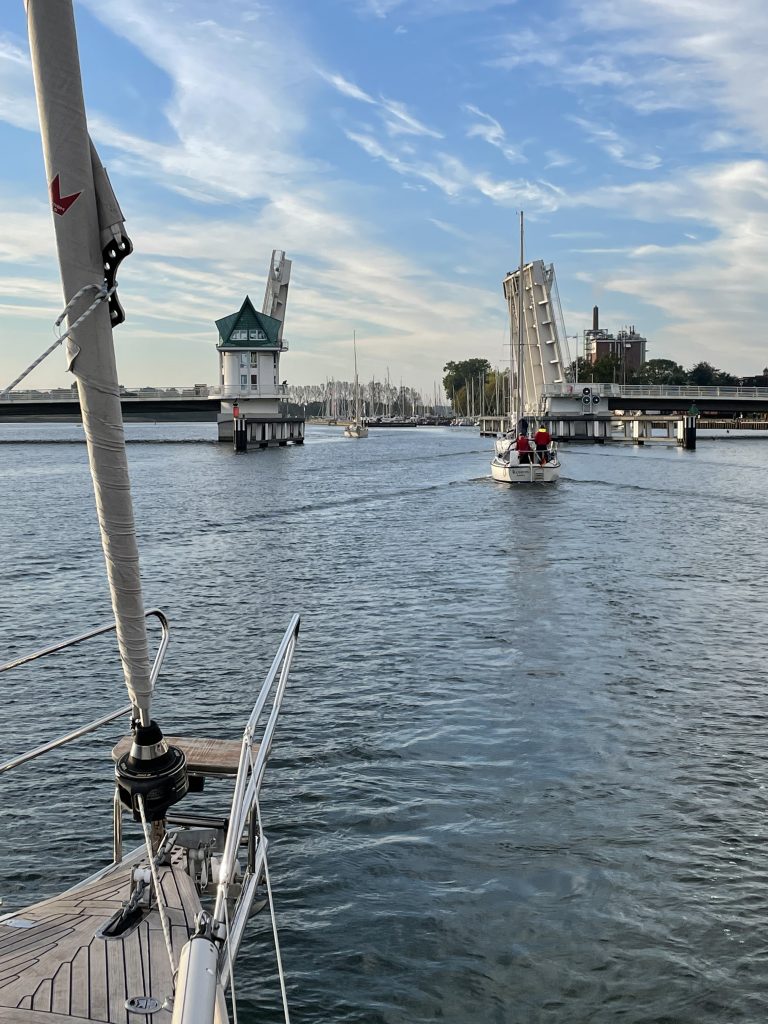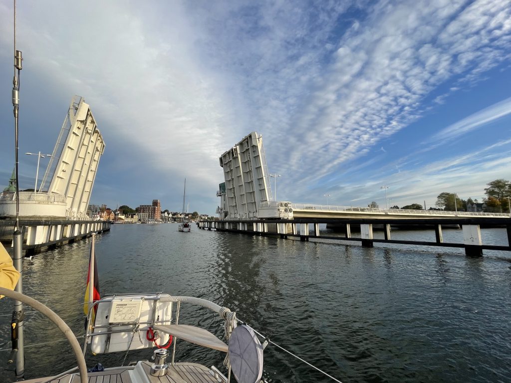 Und auch die Brücke bei Lindaunis – das aktuelle Sorgenkind der Schlei – öffnet pünktlich um 10.45h. Hier treffen wir auch einen Segler wieder, den wir in unserem Urlaub in Svendborg kennengelernt haben – so klein ist die Welt. Wir erzählen ein bisschen so von Schiff Pilgrim zu Schiff Gabbiano und verabreden uns locker für ein Treffen auf dem Weihnachtsmarkt in Braunschweig – wenn er denn stattfindet. Der Eigner Gabbiano kommt aus Braunschweig und will sich melden. Mal schauen, ob das klappt.