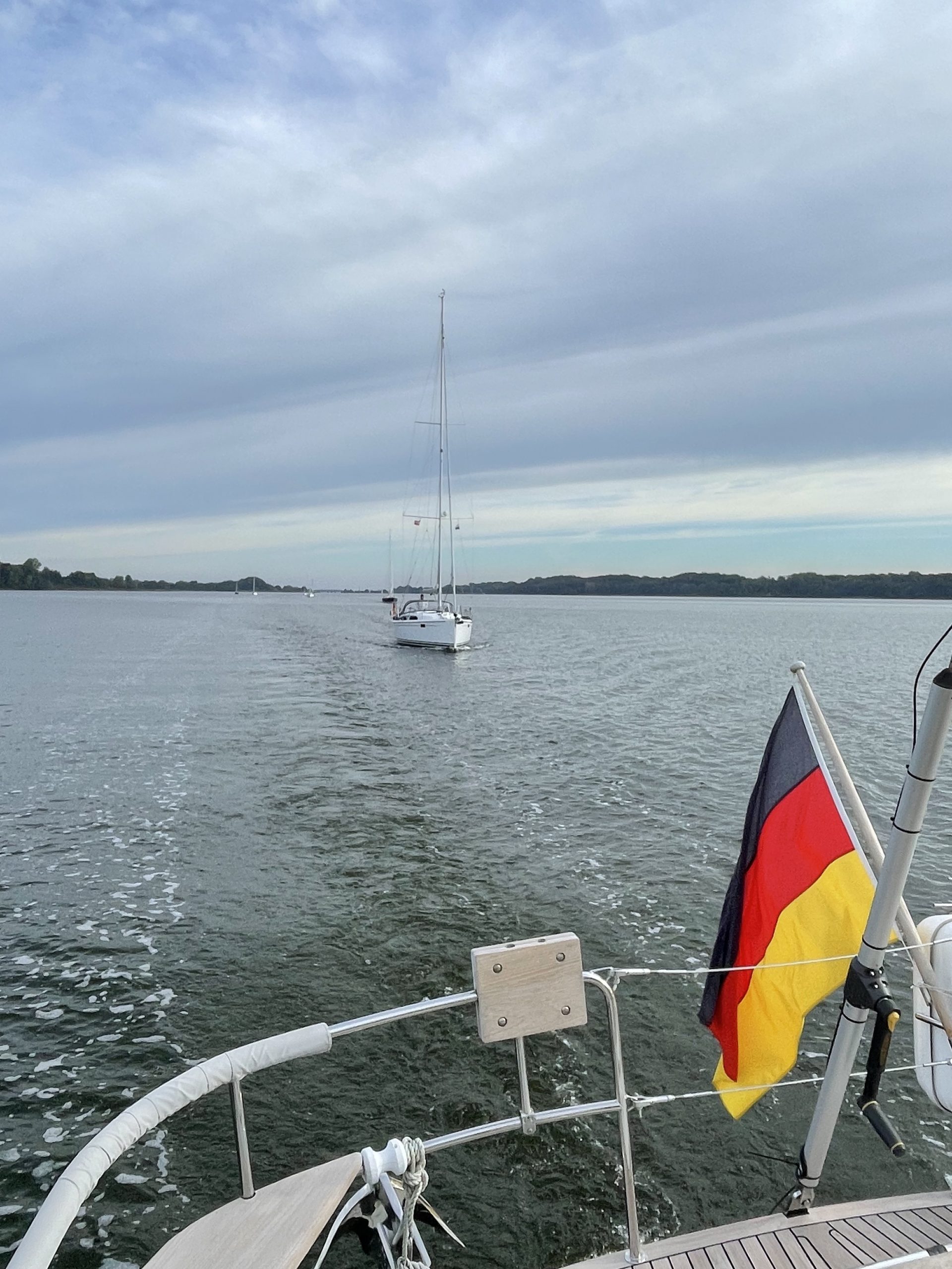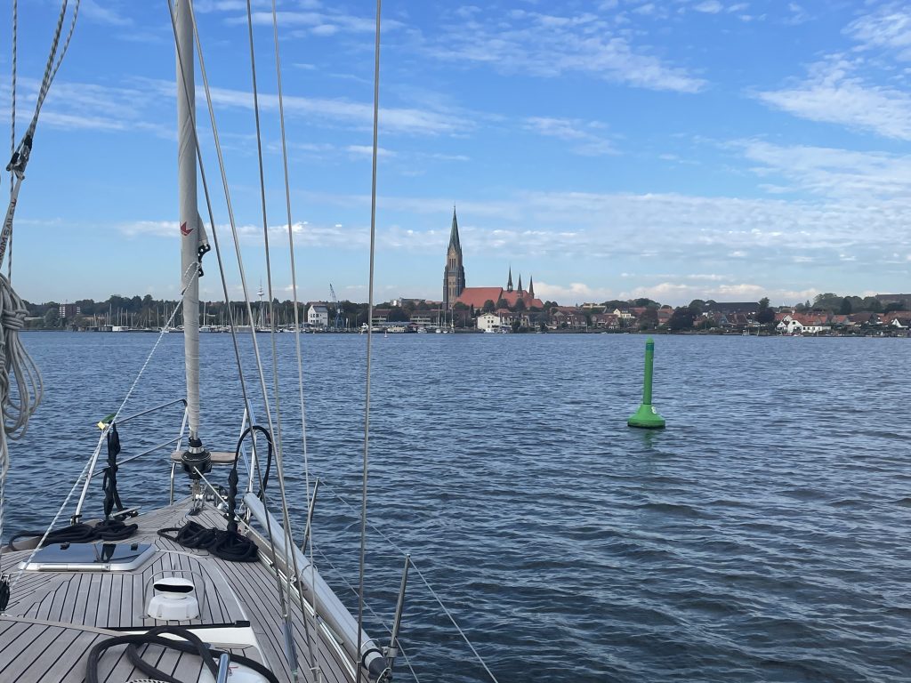 Dann fahren wir doch ein wenig schneller weiter, denn in Schleswig wollen/müssen wir noch unser Vorsegel abschlagen… und den Baum abnehmen und an Deck sicher lagern… und alle Fallen aus ihren Führungen ziehen und durch Pilotleinen ersetzen… und Leinen aufschießen und gut verzurren… und elektrische Geräte abkabeln… und… und… und…