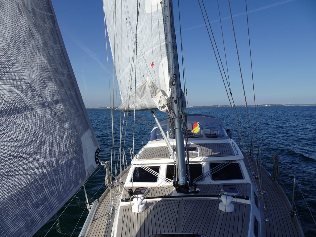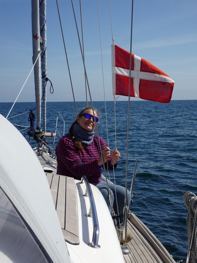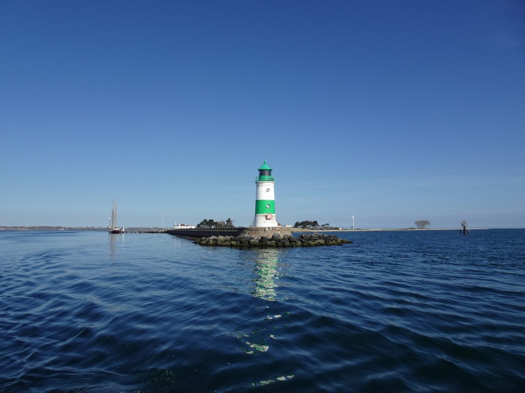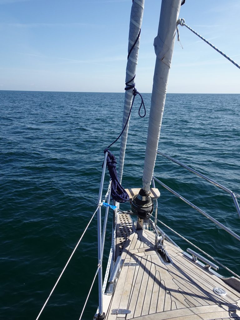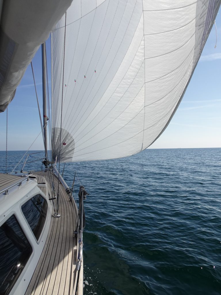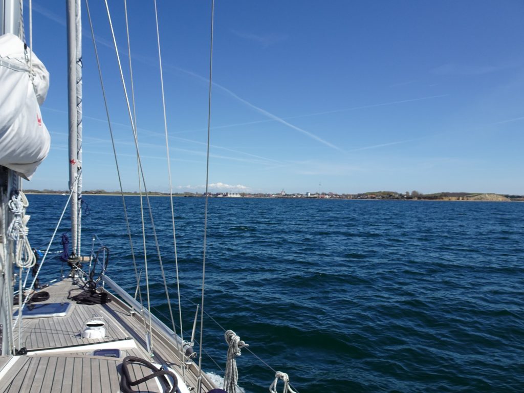Und jetzt aber… den Leuchtturm Schleimünde passiert und dann endlich die Segel hoch. Die Kieler Bucht zeigt sich von ihrer freundlichen Seite. Was für ein friedliches Dahingleiten… wenig Welle, Sonne, angenehme Temperatur, leichter Wind… der richtige Wind für unseren CodeZero (Leichtwind-Vorsegel). Also Segelwechsel. Der CodeZero muß ran. Ideal bei dem aktuell leichten Wind… dem ganz leichten Wind… bei kaum Wind… Mist. Das ist nun selbst für ein Leichtwindsegel eine zu geringe Windstärke. Also Segel wieder rein und Maschine an, denn ankommen wollen wir schon. Endlich nach Dänemark. Und ja nicht übermütig werden. Eine Stunde segeln am ersten Tag ist doch wohl ok.