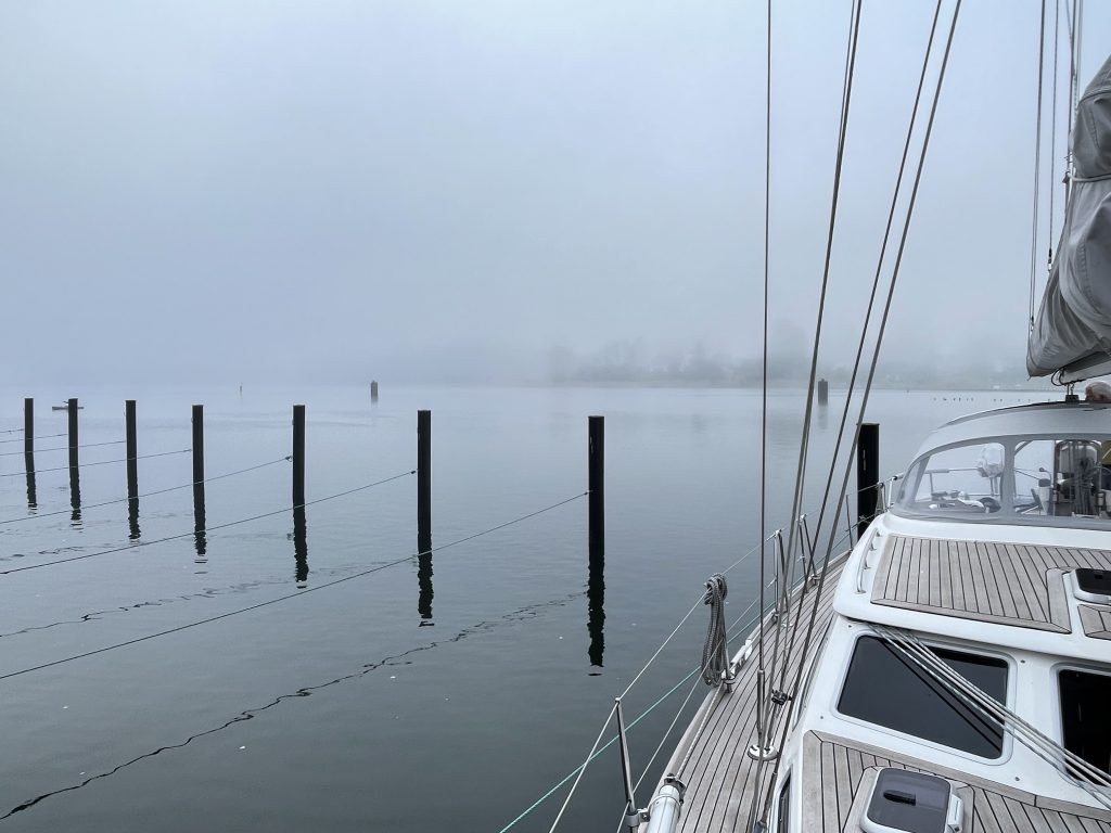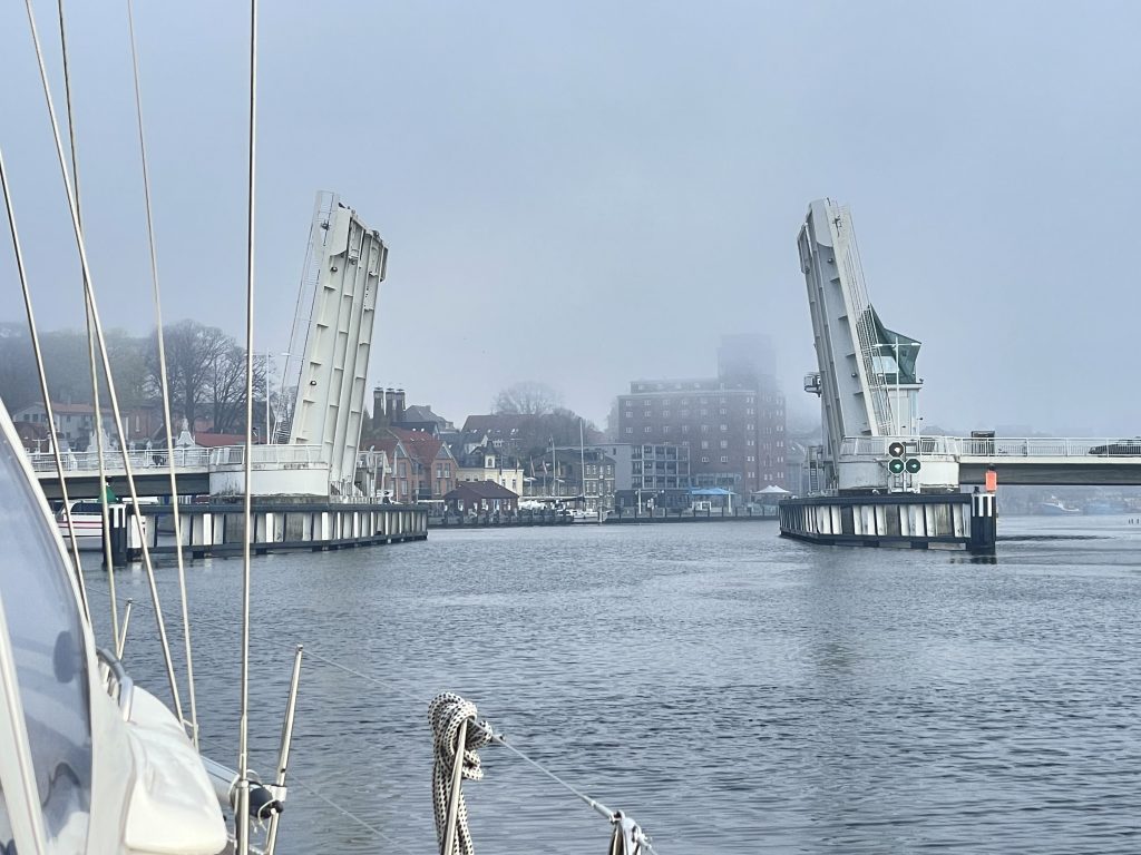 Allerdings… kaum haben wir die Brücke passiert, verhüllt sich die Schlei im Nebel des Grauens. Sie will uns nicht fahren lassen. Nebel gefällt uns bei dem engen Fahrwasser nicht so gut, folglich legen wir erst mal wieder an. Diesmal im Kappelner Nordhafen. Immerhin sind wir schon ein Stückchen weiter… und durch die Brücke durch!!!