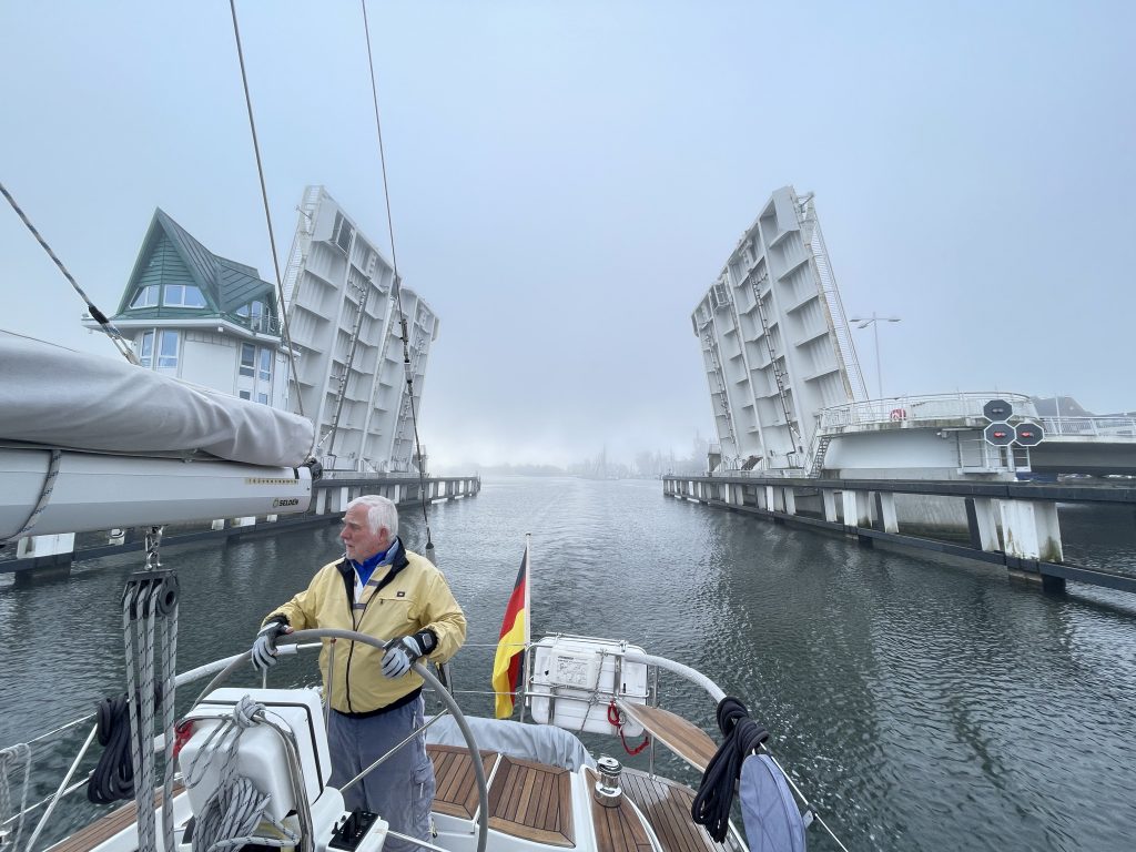 Dann endlich ablegen und zur Brücke… und sie klappt… sogar auf!!! Der Brückenwärter winkt uns freundlich – wir sind das einzige Schiff zu solch einer frühen Stunde. Es ist immerhin erst 07.45 h.
