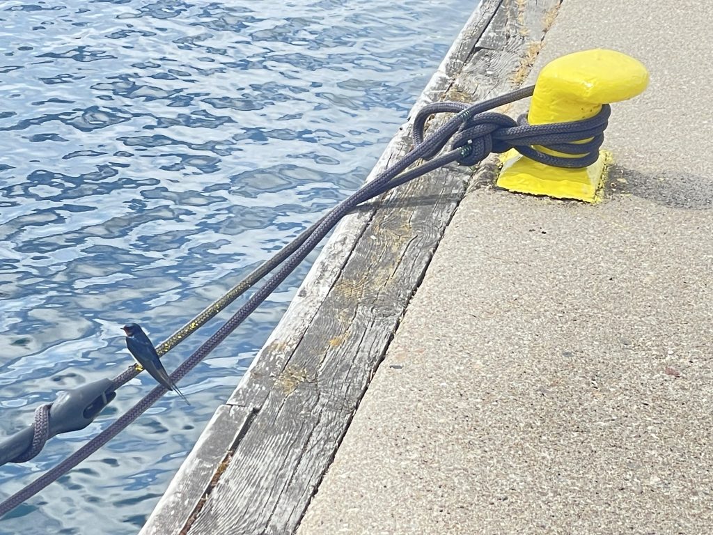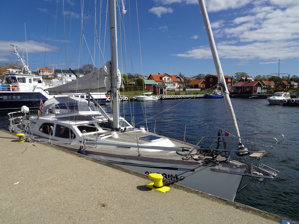 Der Hafen hat sich für die demnächst erwarteten Gäste schon hübsch herausgeputzt: die dicken Treckerreifen, die als Schutz für die anlegenden Schiffe an der Mole hängen, sind alle strahlend weiß gestrichen. (Wenn dann ein Schiff dran scheuert, gibt es wenigstens nicht so häßliche schwarze Streifen.) Und auch die Poller, an denen man seine Leinen festmachen kann, sind neu strahlend gelb angestrichen. Sieht richtig schwedisch aus: leuchtend blauer Himmel, sonnengelbe Poller. Hübsch! Das unsere Festmacherleinen jetzt auch ein bisschen gelb sind, weil die Farbe wohl noch nicht völlig getrocknet war… nunja, es gibt schlimmeres. Wir sind jetzt quasi richtig in Schweden angekommen.