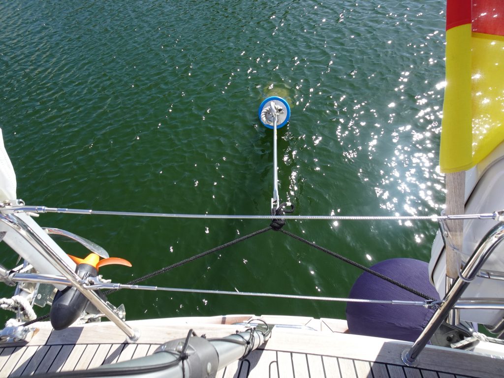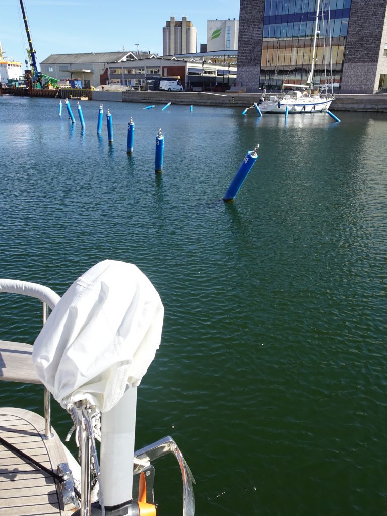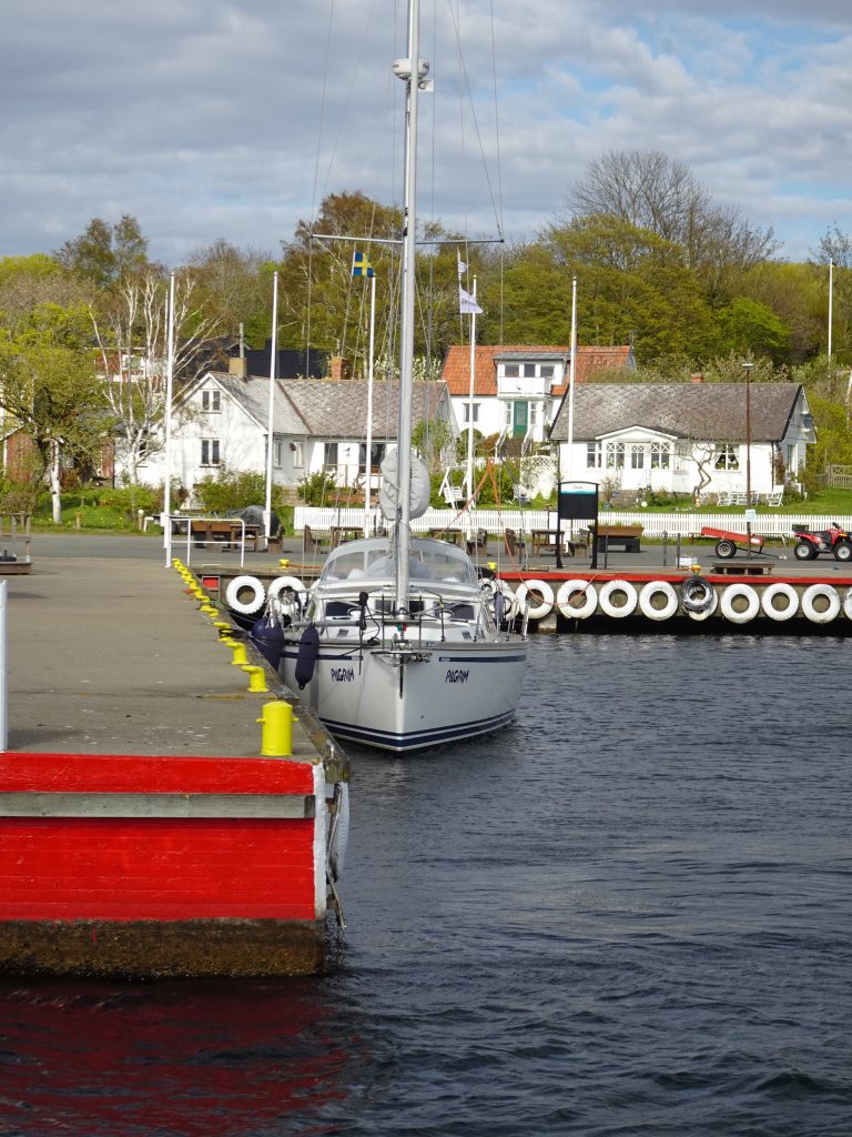 Im Hafen haben wir jetzt auch das erste Mal die für Schweden typischen Heckbojen zum festmachen der Achterleine. Ist bei dem meist felsigen Untergrund viel leichter zu installieren, als die in Deutschland und Dänemark üblichen Heckdalben und natürlich viel flexibler bzgl. Boxenbreite. Hier kann sich, wenn es sein muß, auch nochmal ein zweites Schiff an (m)einer Heckboje mit festmachen. Ok… die Schiffe liegen dann etwas eng aneinander… das muss man auch mögen und erfordert ordentlichen Fendereinsatz. Wir mögen das nicht so. Aber es spart Platz. Eine Box mit fest in den Grund gerammten Dalben ist auch mit einem evtl. viel zu kleinen Schiff eben belegt.