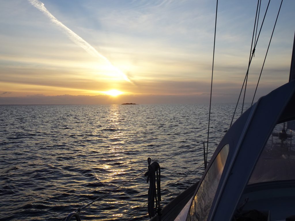 Nachdem der Sonnenaufgang um 05.04h leider etwas von Wolken verdeckt war, zeigte sie sich dann aber doch nach einiger Zeit. Einem Selfie können wir später den Titel „7-7-7“ geben: 7 Uhr, 7 kn Wind (3 Beaufort), 7°C Temperatur. Und Sonnenschein!