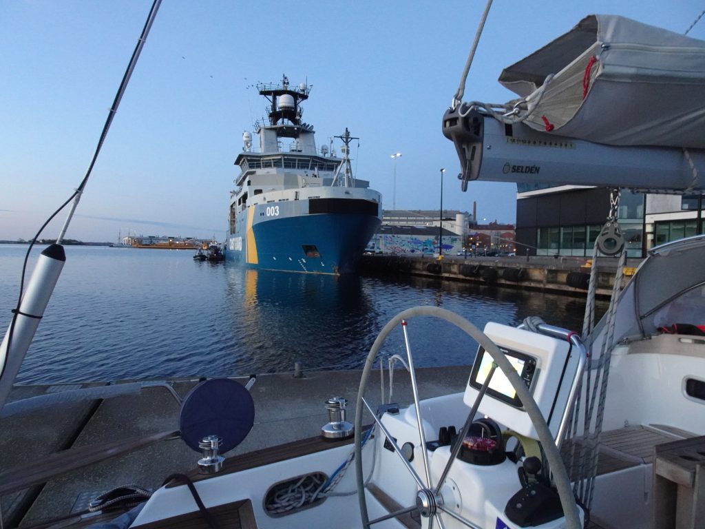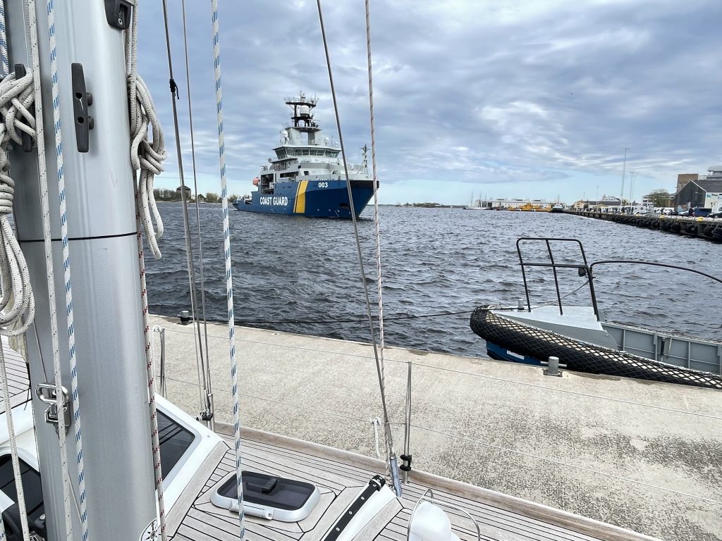 Und der Hafen gefällt uns überhaupt nicht – ist für die Zukunft gestrichen. Ziemlich ungeschützt und nur ganz niedrige Schwimmstege. Und drumherum auch nicht schön. Das einzig gute: heute nacht werden wir gut bewacht. Direkt neben uns hat ein monstergroßes Schiff der Küstenwache seinen Liegeplatz. Sieht echt gewaltig aus. Und es hat so leise und vorsichtig angelegt – trotz Starkwind – das wir es kaum bemerkt haben.