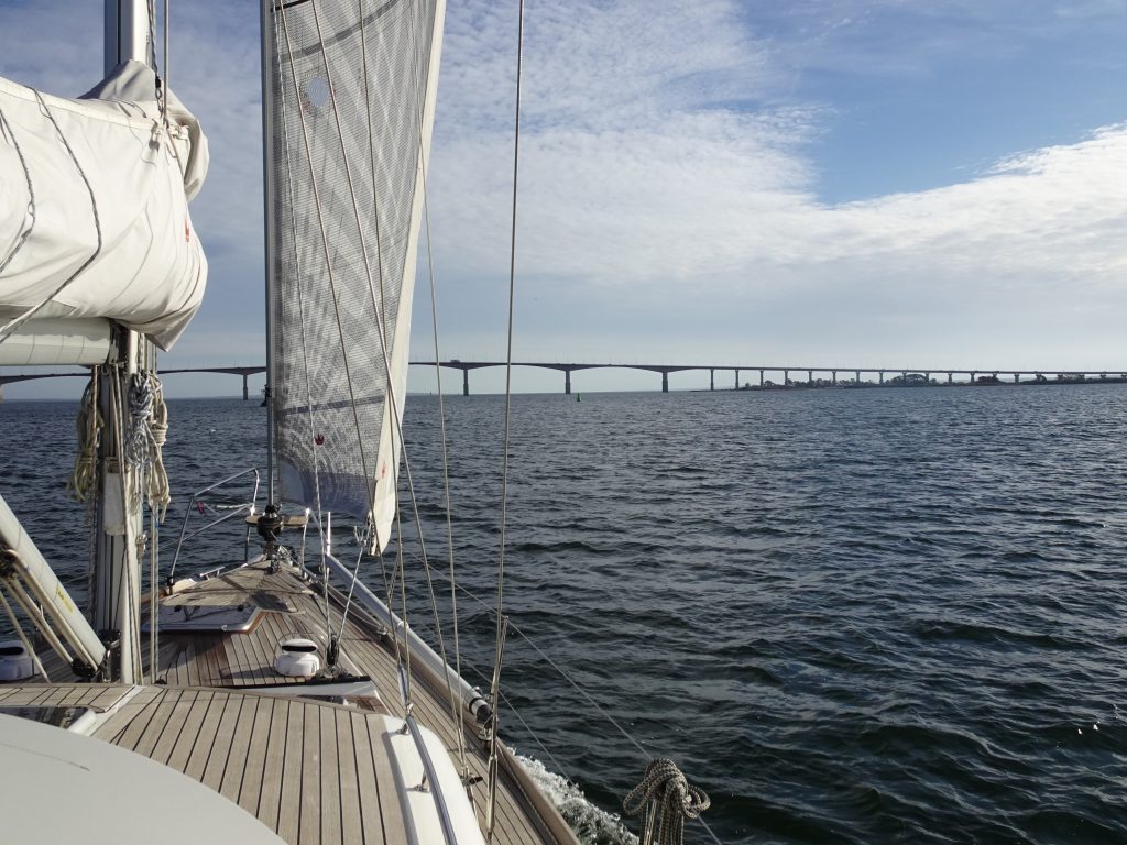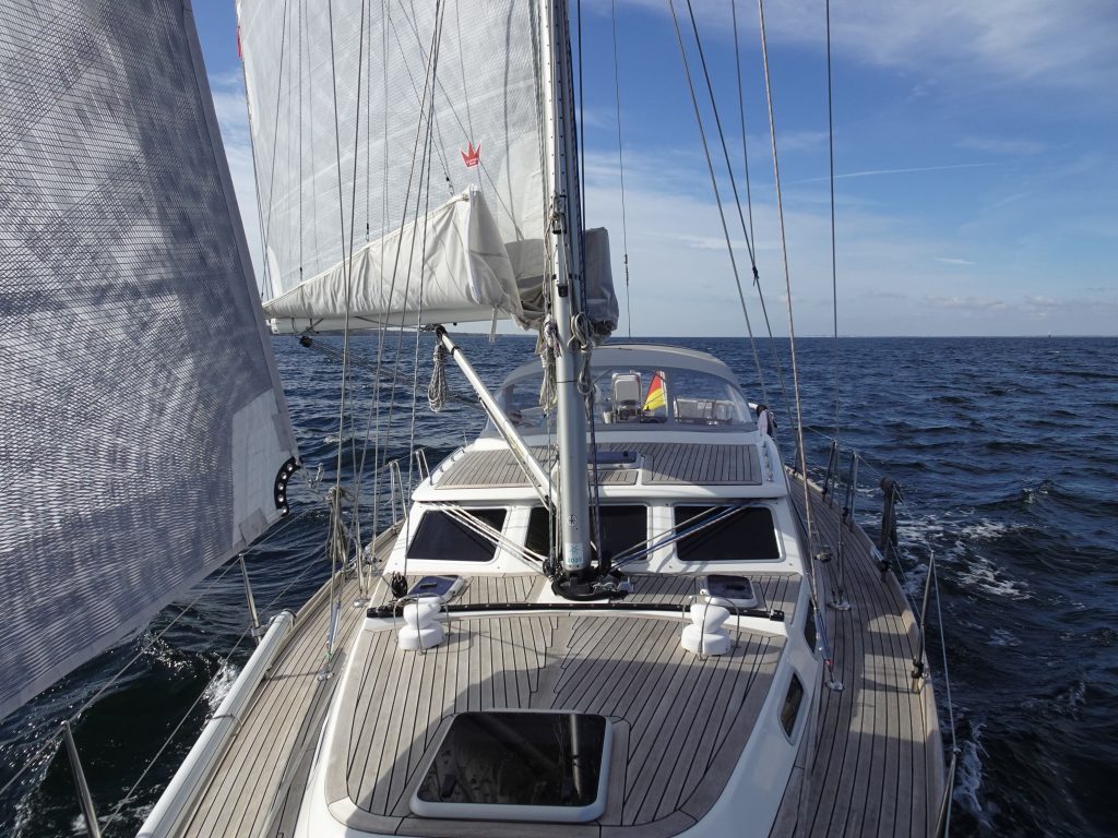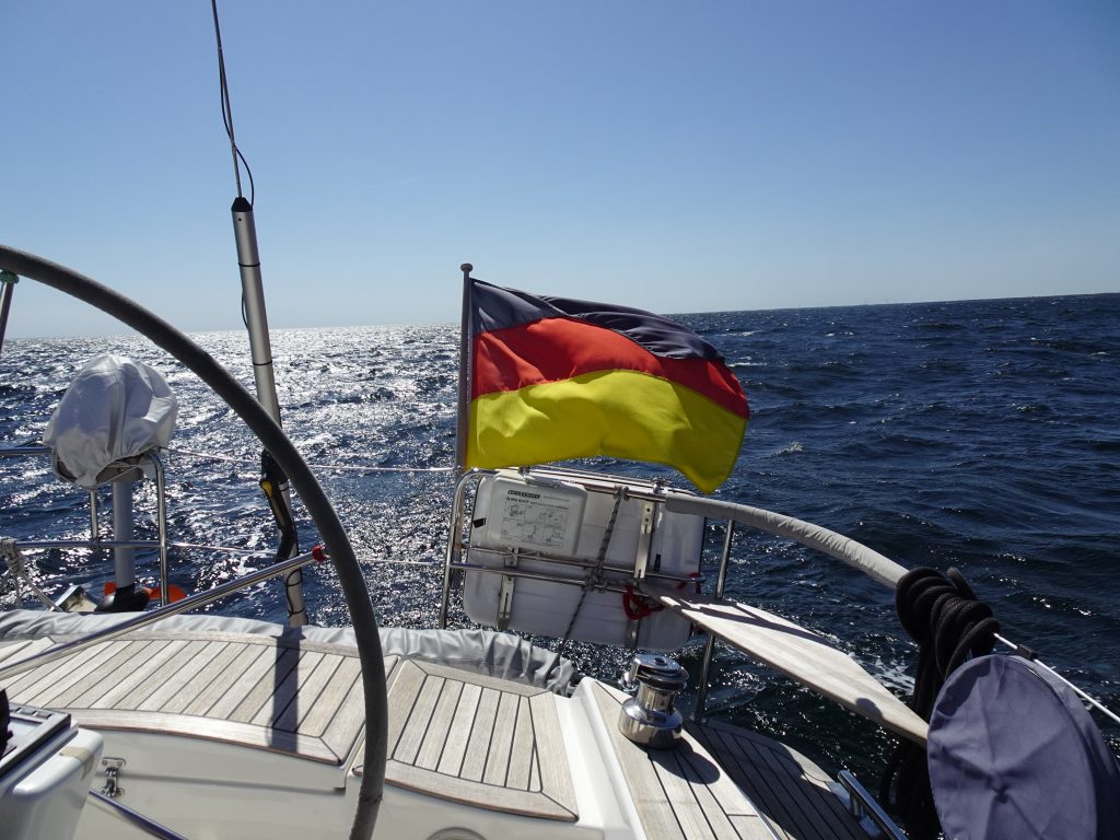 Da wir früh genug gestartet sind, haben wir uns nur für etwa 2h mit gut 6Bft und etwa 1,5-2m Wellenhöhe zu arrangieren. Aber bei einer Etappendauer von gut 10 Stunden ist das auch genug. Wir schauen lieber nicht hinter uns, von wo die Wellen mächtig heran rollen. Bei strahlendem Sonnenschein sieht das aber eher schön als gefährlich aus. Aber die weißen Kronen auf den Wellenkämmen bestätigen uns: 6Bft haben wir!