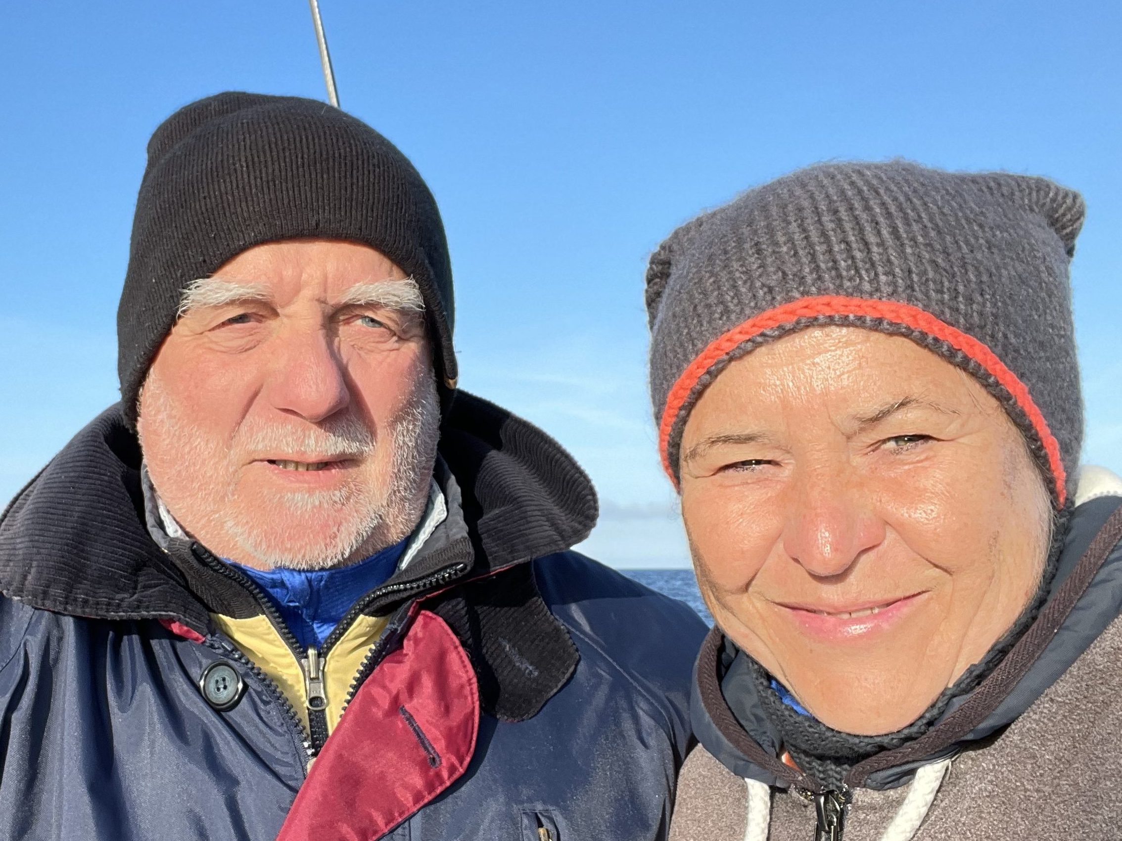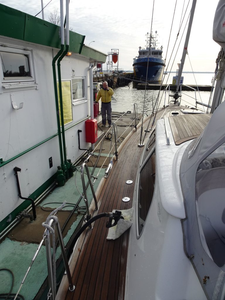Am nächsten Morgen: strahlender Sonnenschein und vorbeisausende Wolken. Starkwind mit 7Bft genau von vorne pfeift durch die Wanten – die angesagte Winddrehung passt👏👏… wir schaukeln gemütlich an unserem Liegeplatz längs an der Mole und unsere Fender schwingen locker am Rumpf des Schiffes. So gefällt uns das!