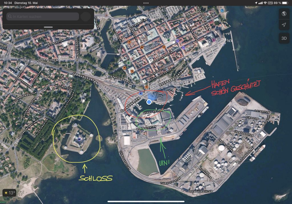 Der frühe Vogel… ist dann auch früh am nächsten Ort. Wir hatten Karlskrona als Ziel gewählt, weil wir Diesel nachtanken müssten. Doch erstens dreht der Wind kurz vorm anlegen mal wieder richtig auf – da sind wir dann immer froh, wenn wir gut angebunden sind und nicht wieder los müssen – und zweitens ist die Tankstelle an solch einer blöden Stelle… niemand konnte uns sagen, wie denn die Wassertiefe davor ist. Wie blöd ist das denn? Warum steht das nicht korrekt im Hafenhandbuch?