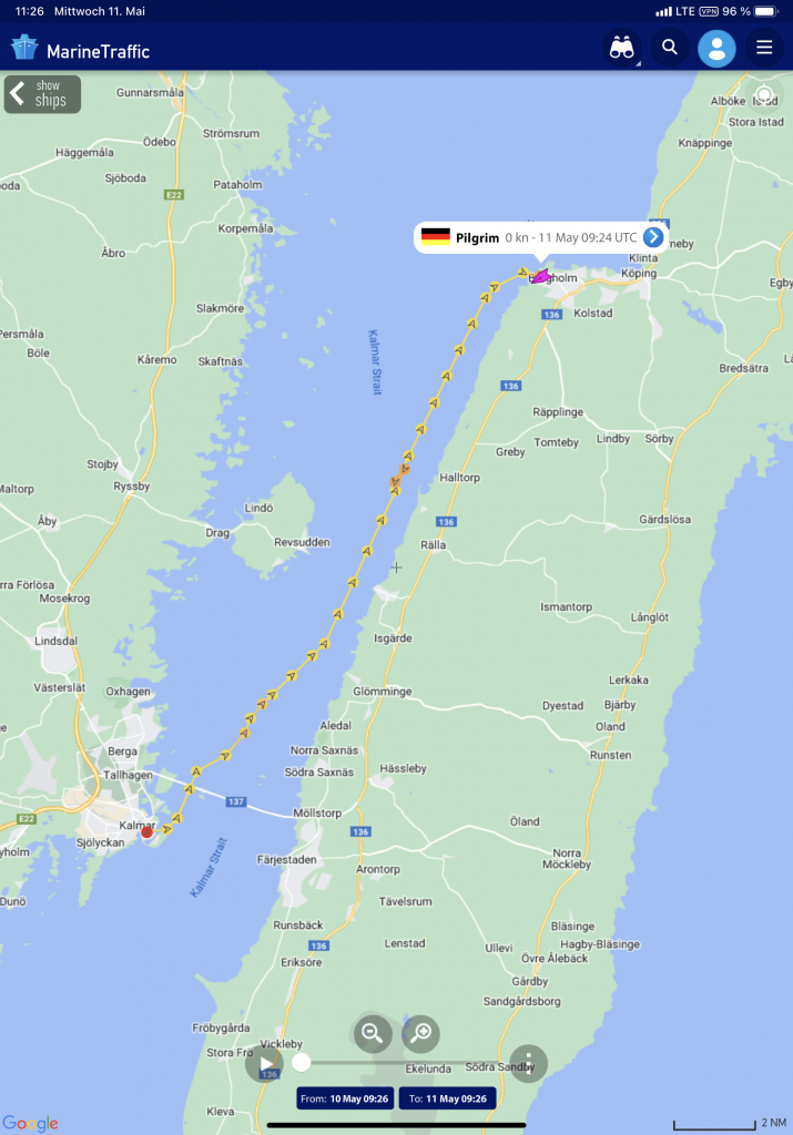 Gesagt, getan. Montag, 09.Mai, um 04.30h legen wir ab. Die Vorhersage bestätigt sich: morgens 3Bft Wind… wir kommen gut voran. Auch als wir in den Kalmarsund einbiegen – endlich gen Norden!! – läuft es prima. Der Wind nimmt dann stetig zu – die Welle natürlich ebenfalls – auch die Windrichtungsänderung kommt… alles wie vorhergesagt. Wind und Welle von schräg achtern schieben uns zügig voran. Auch das hatte der dmi (mein Wetterberichts-Favorit) gut vorhergesagt. Wie die das immer – naja, meistens – so genau hinkriegen ist mir schleierhaft. Heute hat es jedenfalls bombig gepaßt.