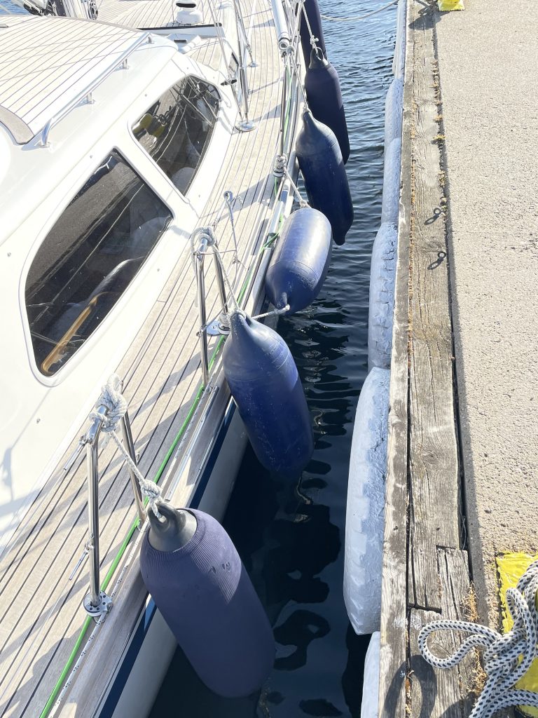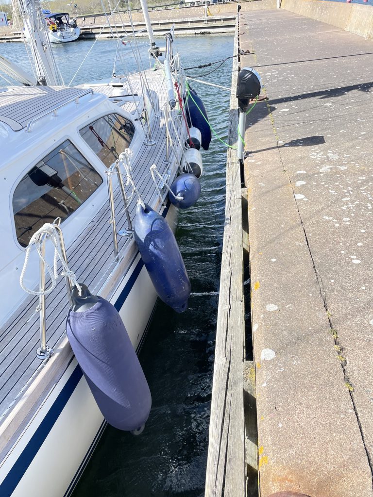 Übrigens tun unsere sogenannten Urlaubsfender bei dem Starkwind gute Dienste. Normalerweise haben wir sechs ordentliche Fender als Bordwand-Schutz im Hafen dabei. Und noch drei kleine ältere Modelle… man weiß ja nie. Seit letzten Sommer haben wir zusätzlich noch drei alte, arg ramponierte und wirklich nicht mehr schöne Fender an Bord. Aber heile! Unser Segelfreund André hat sie gefunden und uns für die Reise überlassen. Im letzten Jahr haben wir sie abwechselnd benutzt… wer sie brauchte, hat sie ans Schiff gehängt. Mal beschützten sie Danae, mal Pilgrim vor angriffslustigen Gast-Nebenliegern. Jetzt helfen sie uns sehr! Dank an André!
