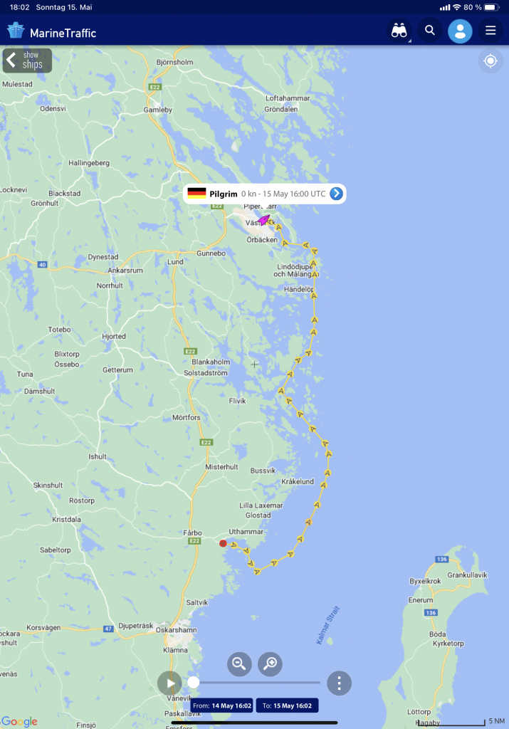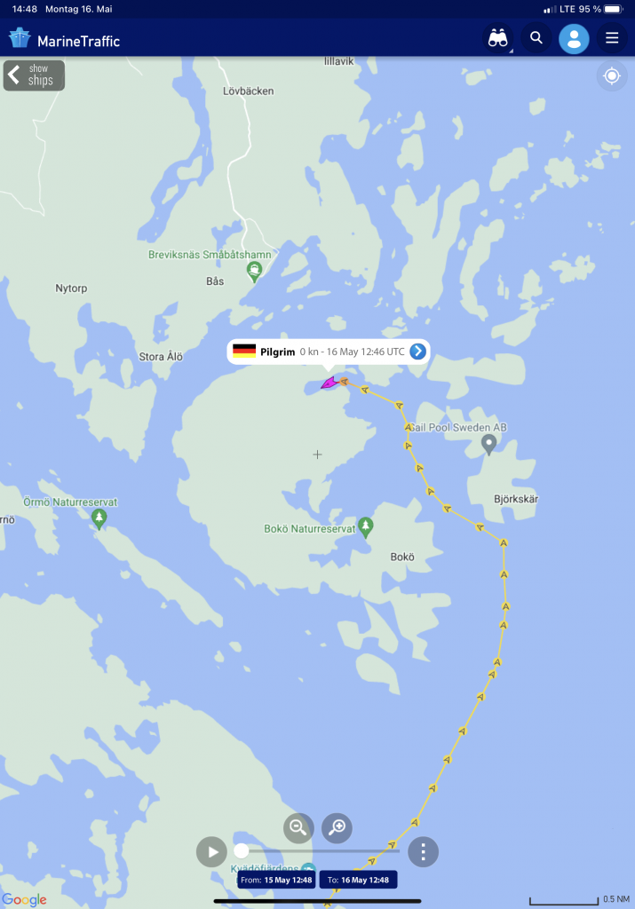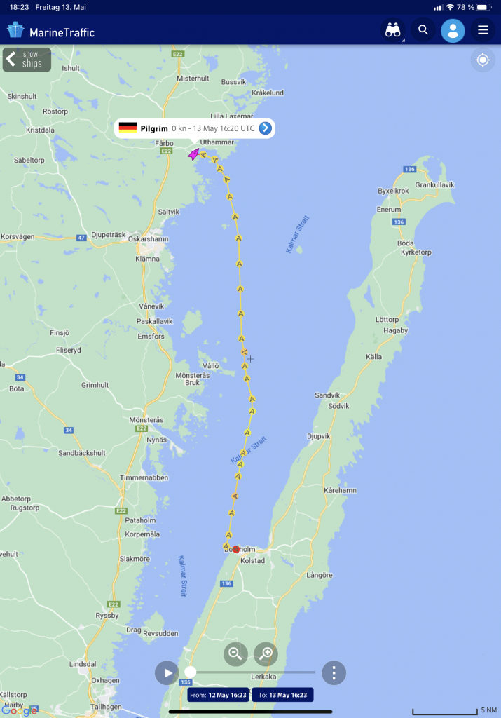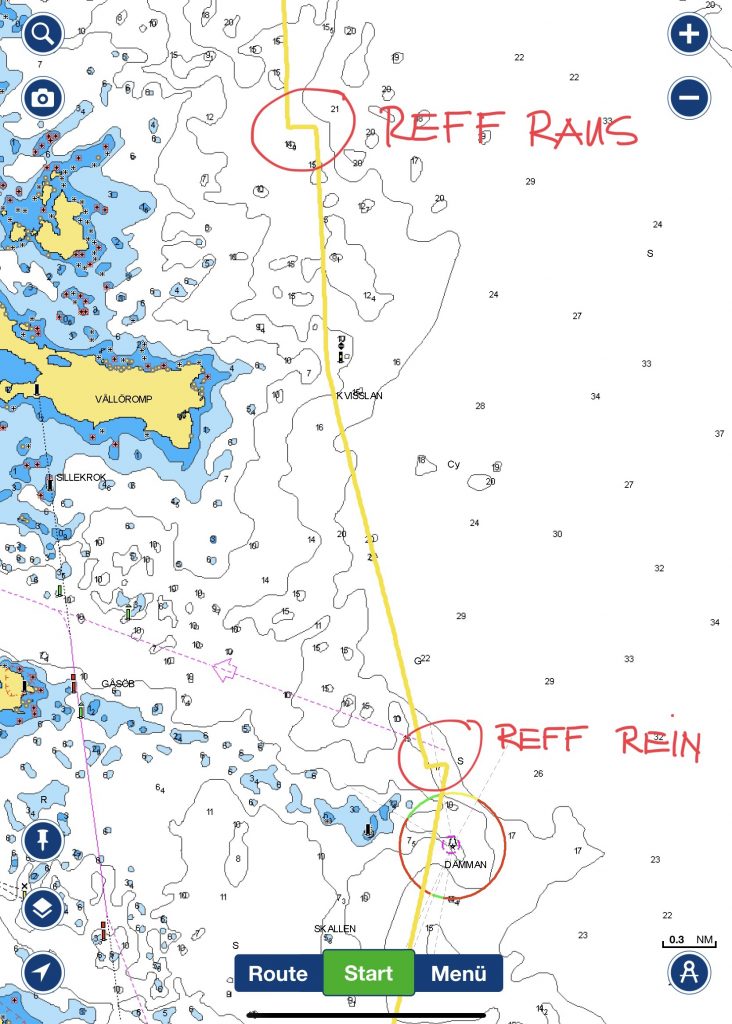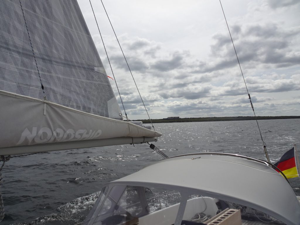 Schon im Hafen ziehen wir unsere zwei Reffs ins Großsegel – besser ist besser. Und ab geht’s. Die Tatsache, dass der Westwind über das nahegelegene Festland kommend auf den hier noch relativ schmalen Kalmarsund trifft, bedeutet, dass das Wasser nicht viel Zeit hat, sich zu Wellen zu formieren. Wir haben also (immer noch) reichlich Wind, aber kaum Welle. Und halber Wind, also Wind von der Seite, läßt unseren Dampfer laufen wie verrückt 👏👏😍 Wir haben zeitweilig 8kn Geschwindigkeit auf der Logge stehen – über Grund, ohne Strömung, die uns mitzieht! Einfach genial. Habe leider vor lauter Begeisterung vergessen, ein Foto zu machen.🤷