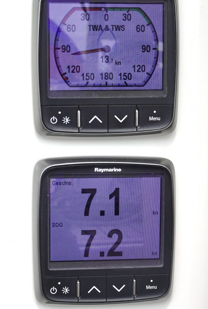 Nach einiger Zeit kommt die versprochene bzw. vorhergesagte kurze Windberuhigung und wir können ausreffen. Mit immer noch 7kn (diesmal mit Fotobeweis) gleiten wir den Kalmarsund hoch gen Norden. Dann wieder ein Starkwindfeld: Reffs wieder rein. Windfeld ist durch: erst ein, dann etwas später auch das zweite Reff wieder raus. Heute ist richtig was los an Bord. Unsere mitgeplottete Kurslinie sieht echt nett aus: immer schön geradeaus, dann plötzlich ein kurzer Zacken (in den Wind zum ein- oder ausreffen), und wieder die Kurslinie weiter geradeaus.