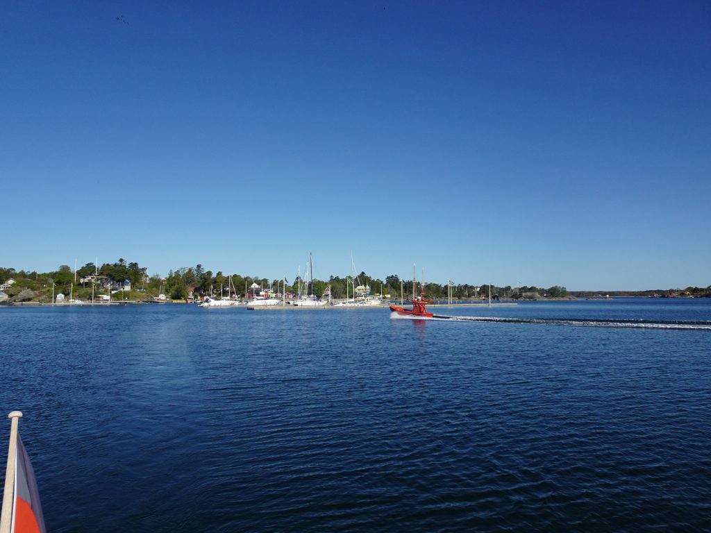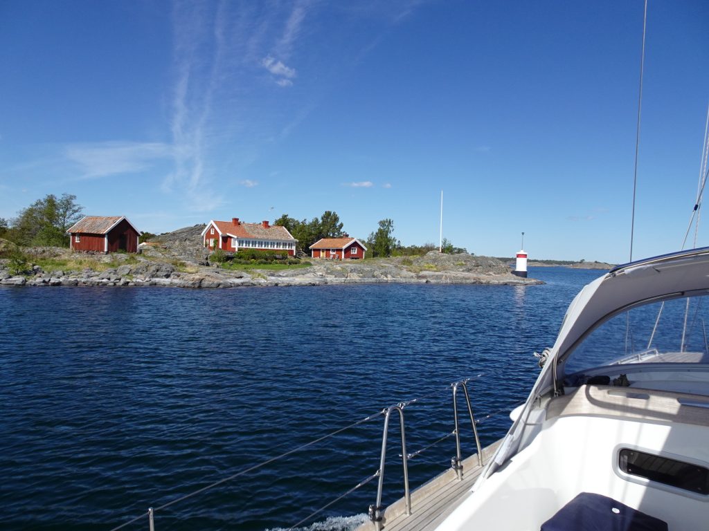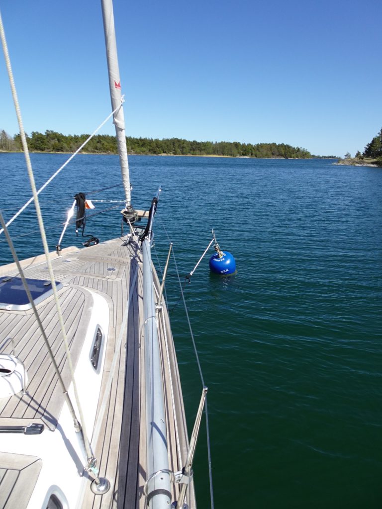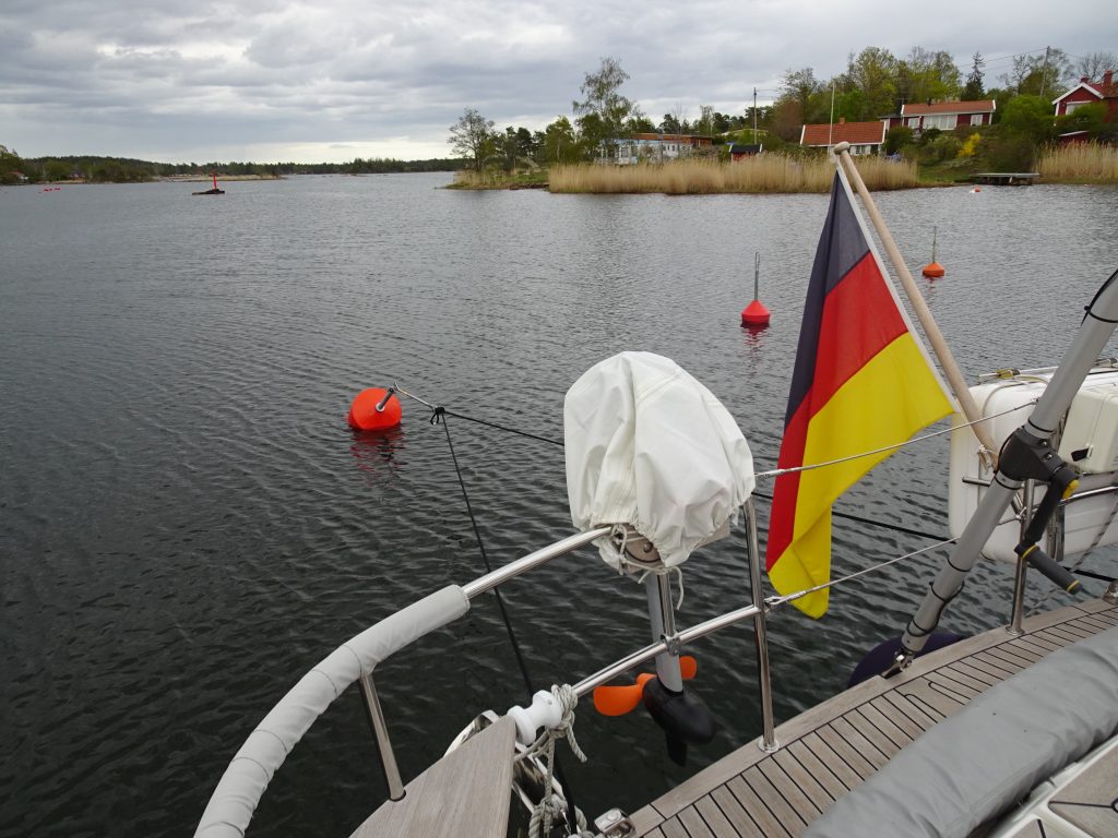 Als nächstes muss es aber endlich mal an eine Boje gehen. Zu dieser Jahreszeit sollte doch wohl noch eine Freie zu finden sein. Vom schwedischen Seglerverband Svenska Kryssarklubben (SXK) – quasi der schwedischen Variante der deutschen Kreuzerabteilung – sind an vielen Stellen in den Schären blaue Bojen ausgelegt. Als Mitglied darf man sie nutzen und muss dann nicht seinen Anker ausbringen. Fühlt sich aber genauso an. Und wir sind Mitglied. Durch eine kleine Flagge, die man am Schiff befestigt, legitimiert man sich. Denn auch Nichtmitglieder dürfen diese Bojen nutzen. Allerdings nur, wenn kein Mitglied Anspruch erhebt.