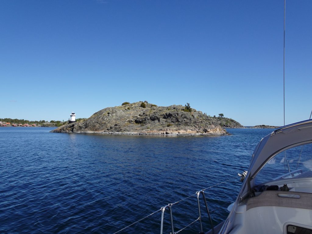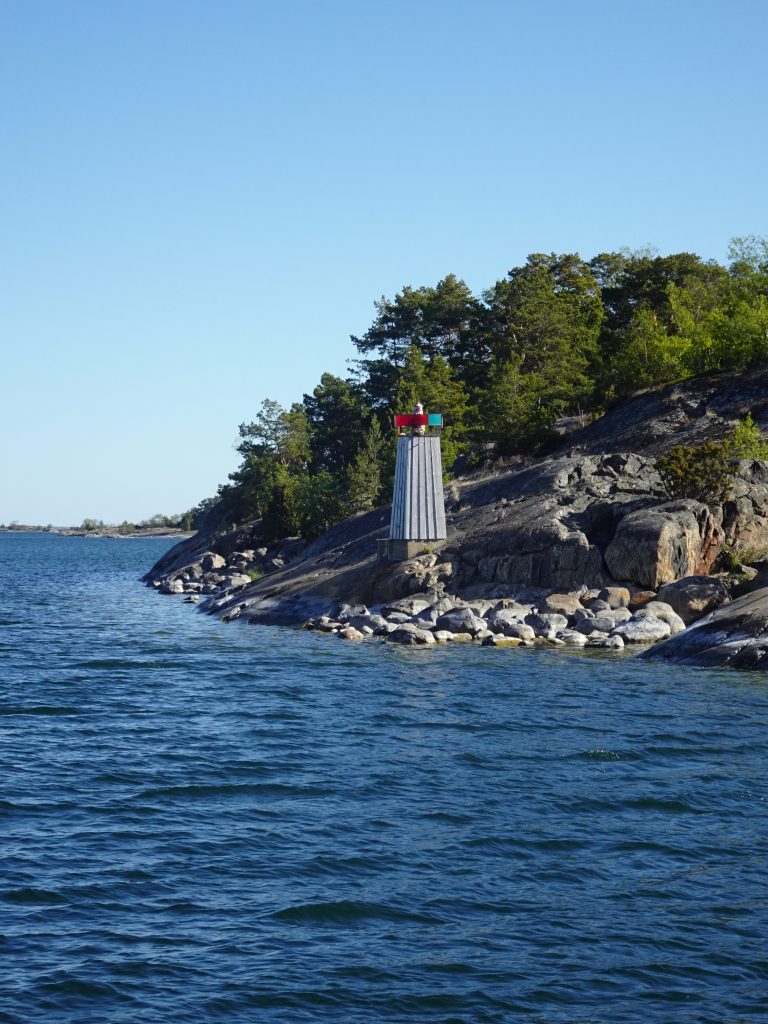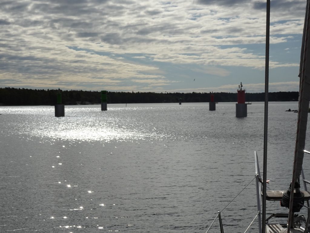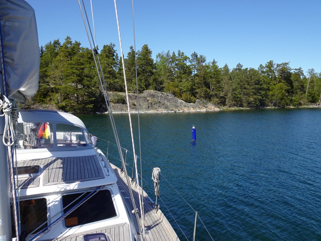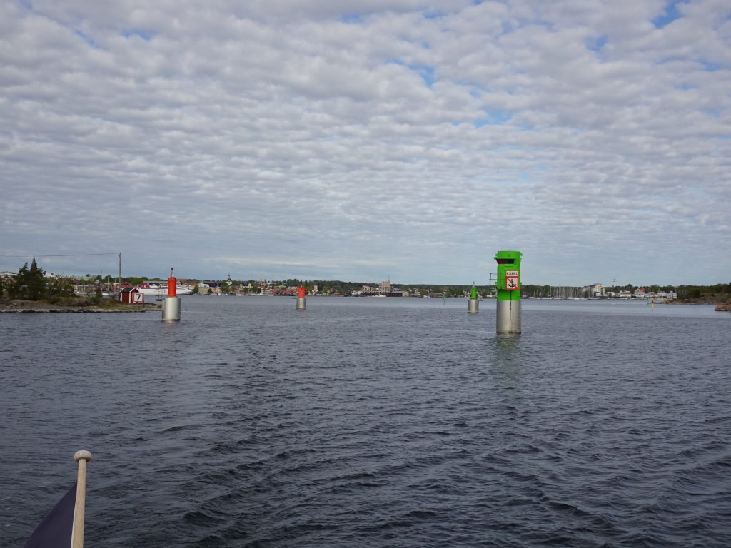 Und dann die Ausfahrt aus Figeholm… gut 2sm durch die Schären… gegen die Sonne… das bringt den Puls richtig in Wallung. Wir können nämlich – gegen die Sonne – die Farbe der Fahrwassertonnen überhaupt nicht erkennen. Und es ist in diesen Gewässern wichtig, das Fahrwasser korrekt zu fahren. Ok, ok, die elektronischen Hilfsmittel an Bord zeigen die Tonnen und die Position des Schiffes exakt an, aber es ist halt ein an manchen Stellen reichlich schmaler Weg zu fahren. Da fühlen wir uns sicherer, wenn wir die Tonnen eindeutig identifizieren können.