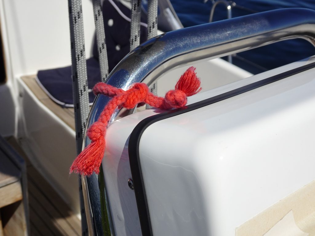 Gedacht, getan: Achterleine – die mit unserer Boje dran – auf die elektrische Winsch gelegt, dann kann Kalli nämlich sowohl die Winsch als auch den Gashebel bedienen, Rückwärtsgang eingelegt, Vorleine schnell los und eingeholt und zügig die Boje an Steuerbord dicht ans Schiff gewinscht. Dann fix die Achterleine von der Boje gelöst… hat alles prima geklappt. Sogar der Wind hat mitgespielt und nicht noch eine Böe geschickt.