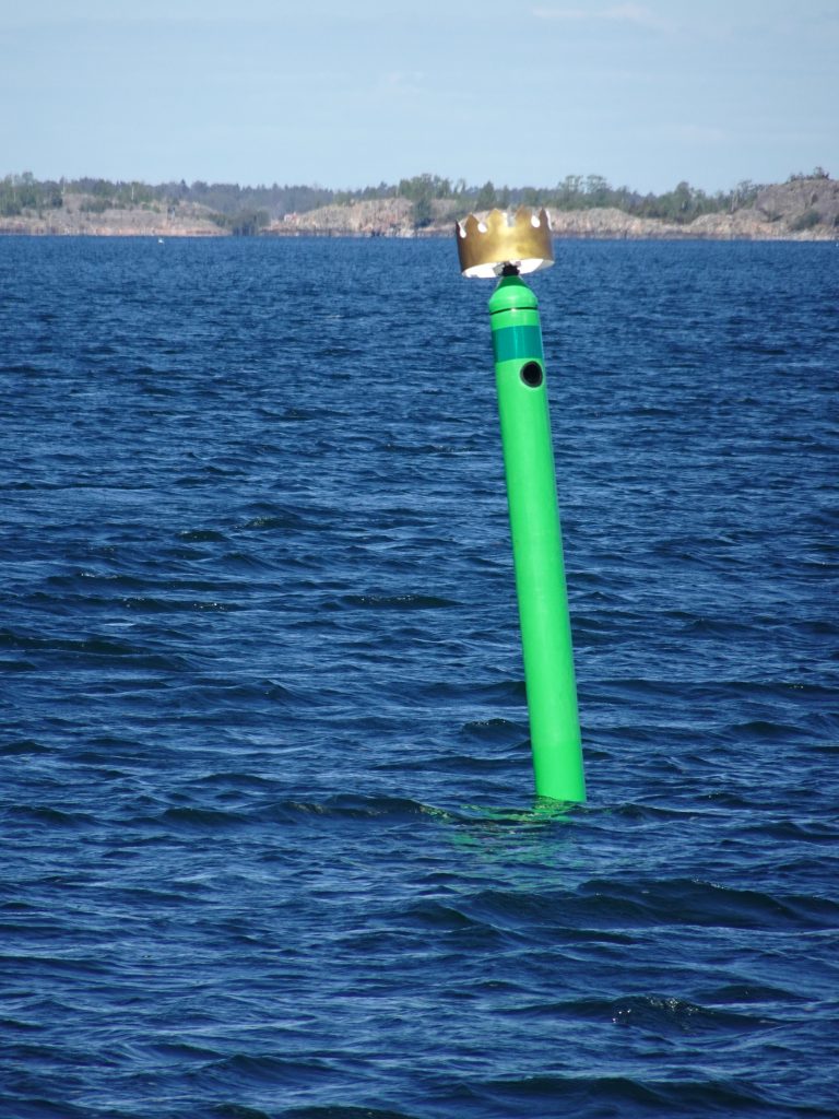 Auf dem Weg nach Arkösund, unserem nächsten Ziel, passieren wir ein ganz besonderes Seezeichen: die Tonne „Kejsaren“, eine grüne Fahrwassertonne mit goldener Krone. Es heißt, dass der dänische König Waldemar 1219 mit seiner Flotte auf dem Weg die schwedische Küste entlang bis nach Finnland hier vorbeigekommen sei. Jedenfalls soll man unbedingt, wenn die Tonne passiert ist, einen Schluck auf ihn trinken. Das machen wir natürlich gerne, obwohl natürlich unterwegs Alkohol normalerweise nur zu medizinischen Zwecken Anwendung findet. 😜🍷🥃