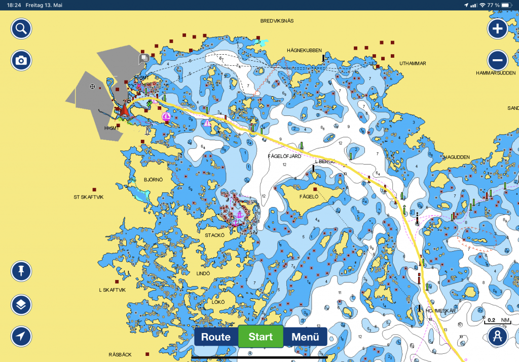 Warum fährt man eigentlich in eine Gegend mit vielen Felsen im Wasser – oder dicht unter Wasser – und damit kaum sichtbar – und meistens mit einer Zick-Zack-Kurslinie? Der Rudergänger den Kartenplotter vor Augen und das zweite Crewmitglied zusätzlich eine Papierkarte in der Hand? Immer mal wieder einen Blick durchs Fernglas mit der Frage: welche Tonne ist das denn jetzt eigentlich? Weil die Navigation interessant ist, die schöne Umgebung gut tut für die Seele und es permanent spannend bleibt, macht man das. Weil man an manchen Stellen von weitem nicht sehen kann, ob der Weg, so wie die Karte es sagt, wirklich weitergeht. Weil viel Natur um einen herum ist. Weil es einfach schön ist!
