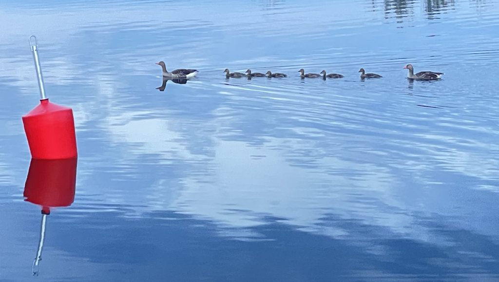 Pilgrim schwoit sanft an der Boje hin und her… immer schön vom Wind in die eine oder andere Richtung gedreht… wir sitzen entspannt im Cockpit und genießen den sich immer wieder ändernden Ausblick auf die Landschaft. Vögel zwitschern und besonders ein Kuckuck tut sich hervor. Ein Fischreiher stolziert am Ufer, das Wasser plätschert über die Felsen… Entspannung pur.