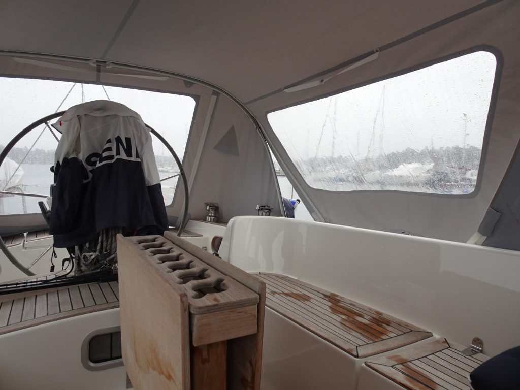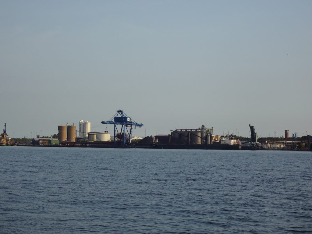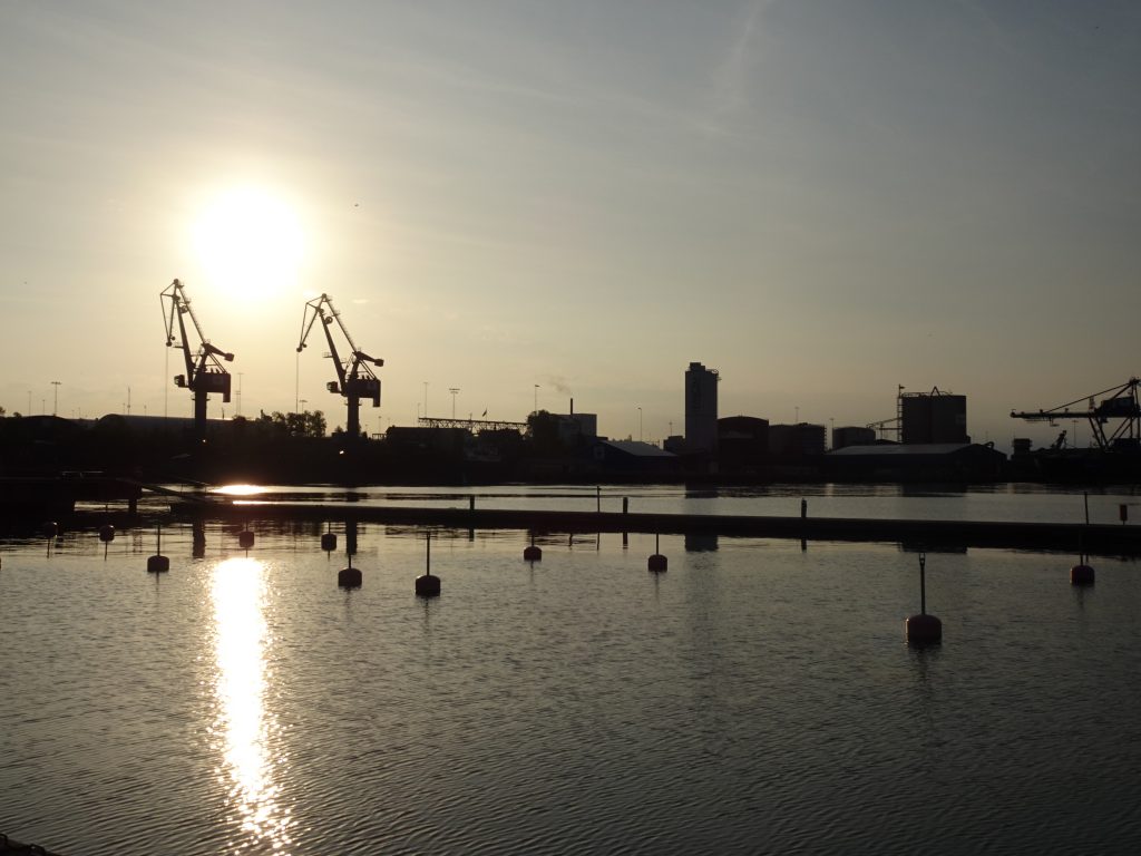 Am Morgen darauf ein ungewohnter Anblick: leichter Regen hüllt alles in ein trübes und eintöniges grau – leider wie vorhergesagt. Das bedeutet: umdrehen und noch ne Stunde schlafen. Dann nutzten wir die Gelegenheit – nach dem ausschlafen – das Schiff mal von dem (Blüten-)Staub der letzten Zeit zu befreien. Es nieselt noch sanft vor sich hin, aller Staub ist naß und schön eingeweicht und läßt sich einfach abwischen. Auch unsere Kuchenbude ist das erste Mal seit unserem Start in Kappeln aufgebaut und kann sich entknittern. Aber mit kurzer Hose und T-Shirt sieht man niemanden mehr… es ist wieder deutlich kälter geworden. Und der Wind bläst kräftig aus Nordost, genau aus der Richtung, in die unser weiterer Kurs führen soll. Bei dem Wind zeigt sich auch, daß der schwimmende Wellenbrecher vorm Hafen – lt. Info-Flyer mit 380m Nordeuropas größter – gute Dienste tut. Davor ordentlich Welle, dahinter ruhiges Hafenwasser.